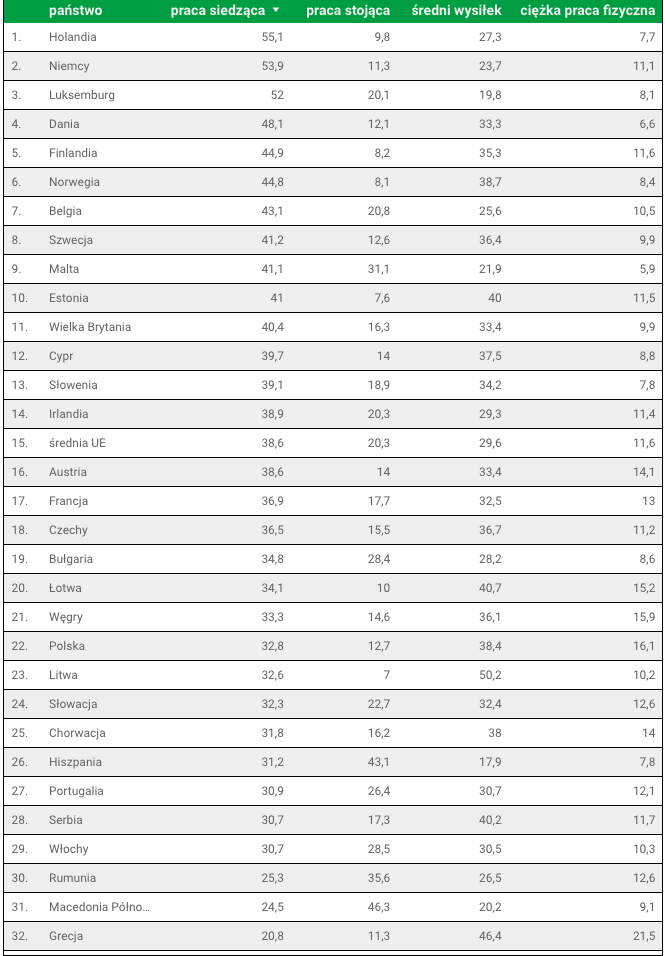W trzech krajach w 2017 roku ponad połowa mieszkańców wykonywała swoją pracę na siedząco – w Holandii (55,1 proc.), Niemczech (53,9 proc.) i Luksemburgu (52 proc.). Najmniej pracowników biurowych było w w Grecji (20,8 proc.), Macedonii Północnej (24,5 proc.) i Rumunii (25,3 proc.).