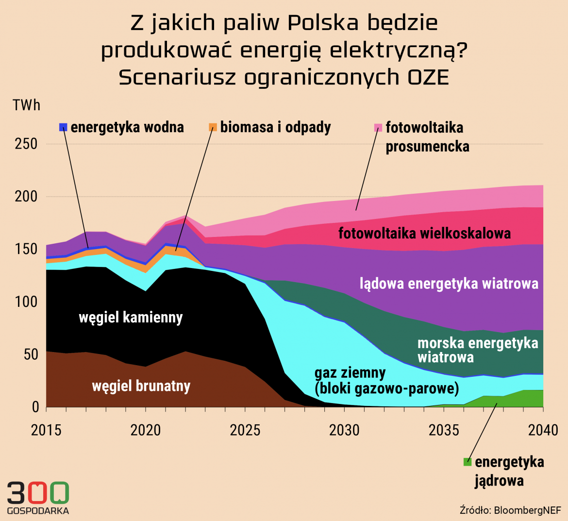 Zmiany w miksie energetycznym w scenariuszu ograniczonych OZE pokazuje poniższa grafika.