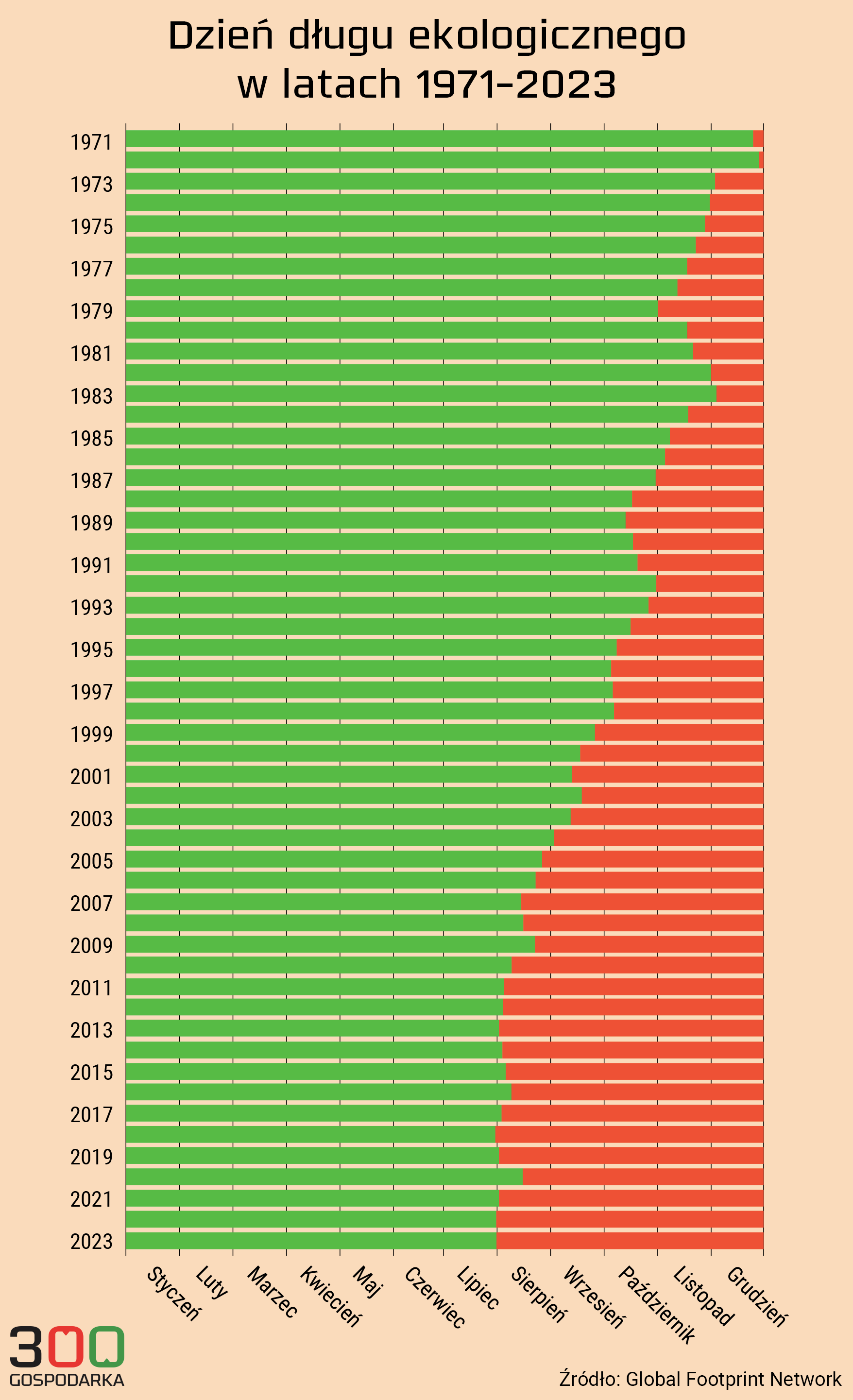 Od lat siedemdziesiątych dzień długi ekologicznego przesunął się bliżej połowy roku. Widać to na poniższej grafice.