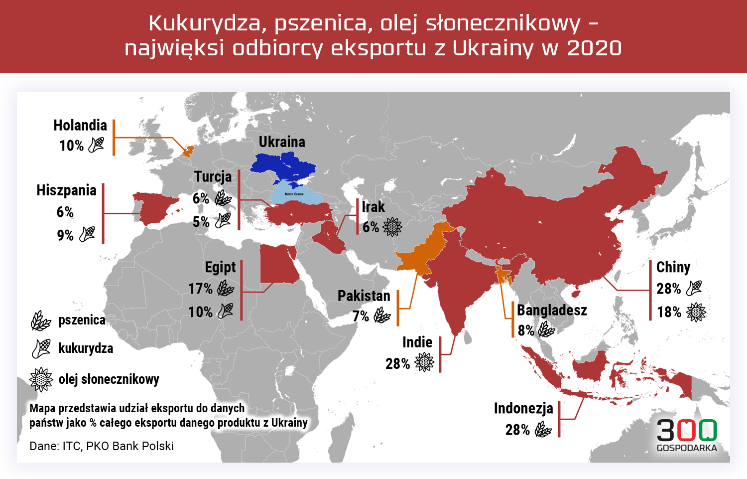 Ukraina eksportowała bardzo dużą część zboża drogą morską. Z danych instytutu IHS Markit wynika, że w 2020 eksport tą drogą stanowił ponad połowę (ok. 56 proc.) ukraińskiego eksportu. A zamknięte obecnie porty w rejonie Odessy odpowiadały za niemal dwie trzecie (64 proc.) wolumenu całego ukraińskiego eksportu zboża.