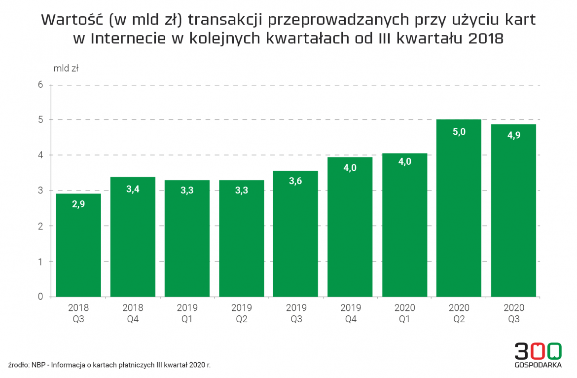 Światło na to, jak się zmieniają upodobania zakupowe Polaków rzuca też badanie NBP. W ciągu trzech kwartałów 2020 roku wartość transakcji zawartych w internecie z użyciem kart płatniczych sięgnęła 13,9 mld zł. To o 3,7 mld zł więcej niż w analogicznym okresie 2019 r. – podał NBP w styczniowym raporcie o kartach płatniczych.