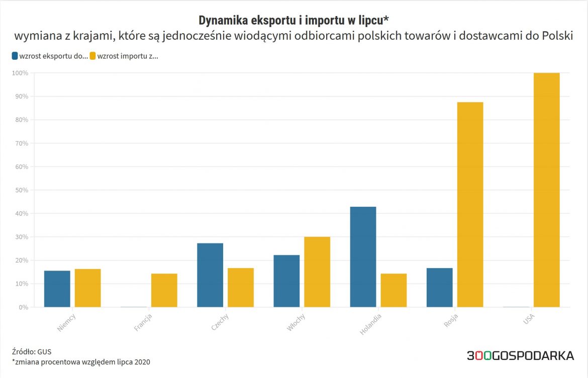 Na podstawie danych GUS przeliczyliśmy, jak wyglądał eksport na najważniejsze dla Polski rynki w samym lipcu. Podobne ćwiczenie zrobiliśmy dla importu. Interesowały nas te kraje, które odgrywają ważną rolę dla obu stron bilansu handlowego – czyli są zarówno ważnymi eksporterami, jaki importerami.