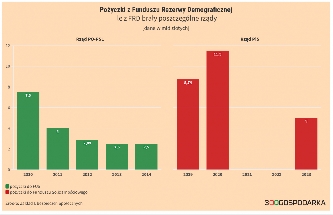 Również w tym roku władza chce sięgnąć po pieniądze z FRD. I to nie małe, bo 5 mld zł. Bez nich nie uda się wypłacić 13. emerytury. Wszystko ma przyjąć formę nieoprocentowanej pożyczki, która powinna być spłacona w 10 równych, rocznych ratach. Początek spłaty wyznaczono na 2028 r. Więcej: Rząd szuka pieniędzy na 13. emeryturę. Sięgnie po Fundusz Rezerwy Demograficznej.