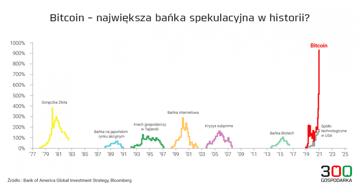 Jacek Rzeźniczek, który także analizuje rynki dla portalu stooq.pl, wskazuje jednak, że wzrost wartości bitcoina o 900 proc. od 2018 roku przyćmiewa wszystkie inne cykle boomu w ciągu ostatnich 50 latach: od szczytu złota w latach siedemdziesiątych dwudziestego wieku do wzrostu Nikkei w latach osiemdziesiątych po kurs Nasdaq 100 w latach dziewięćdziesiątych.