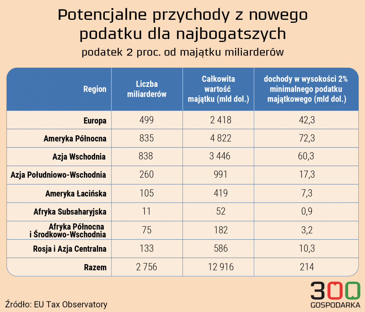 Zdaniem ekspertów minimalny podatek w wysokości 2 proc. od majątku miliarderów na całym świecie wygenerowałby mniej więcej tyle samo dochodów, co globalny minimalny podatek od zysków korporacji wielonarodowych, który wynosi 15 proc. W obu przypadkach to mniej więcej 220 miliardów dolarów, gdyby podatek został wprowadzony w 2023 roku.