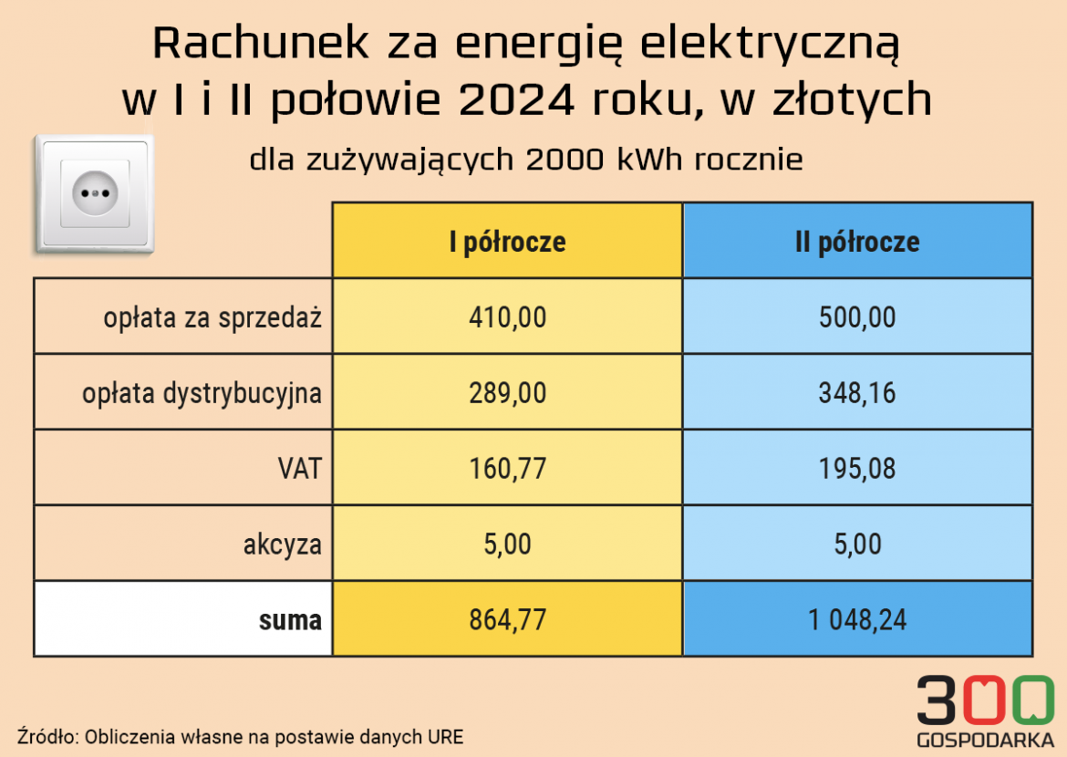 W związku z tymi zmianami, od 1 lipca do 31 grudnia 2024 r., rachunek za energię elektryczną w gospodarstwie domowym, którego roczne zużycie nie przekracza 2 MWh, wzrośnie o 27,5 zł netto miesięcznie. Wzrost brutto wyniesie 33,8 zł na miesiąc. Rachunek w skali całego półrocza pokazuje grafika.