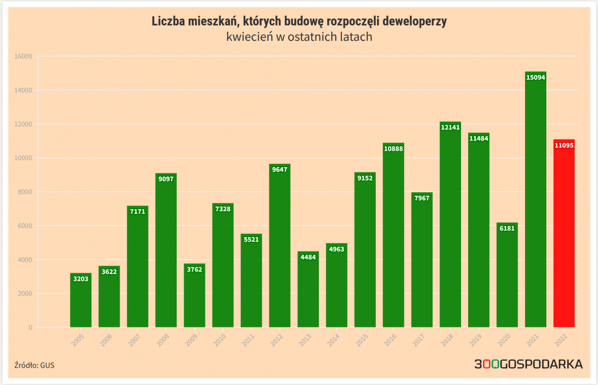 Firmy deweloperskie rozpoczynają ostatnio coraz mniej inwestycji związanych z budową mieszkań. Wynika to z opublikowanych właśnie danych GUS. Według nich w kwietniu liczba mieszkań, których budowę rozpoczęto, było o 23,2 proc. niższa, niż rok wcześniej. W przypadku budów deweloperskich spadek był nawet głębszy i wyniósł 26,5 procent.