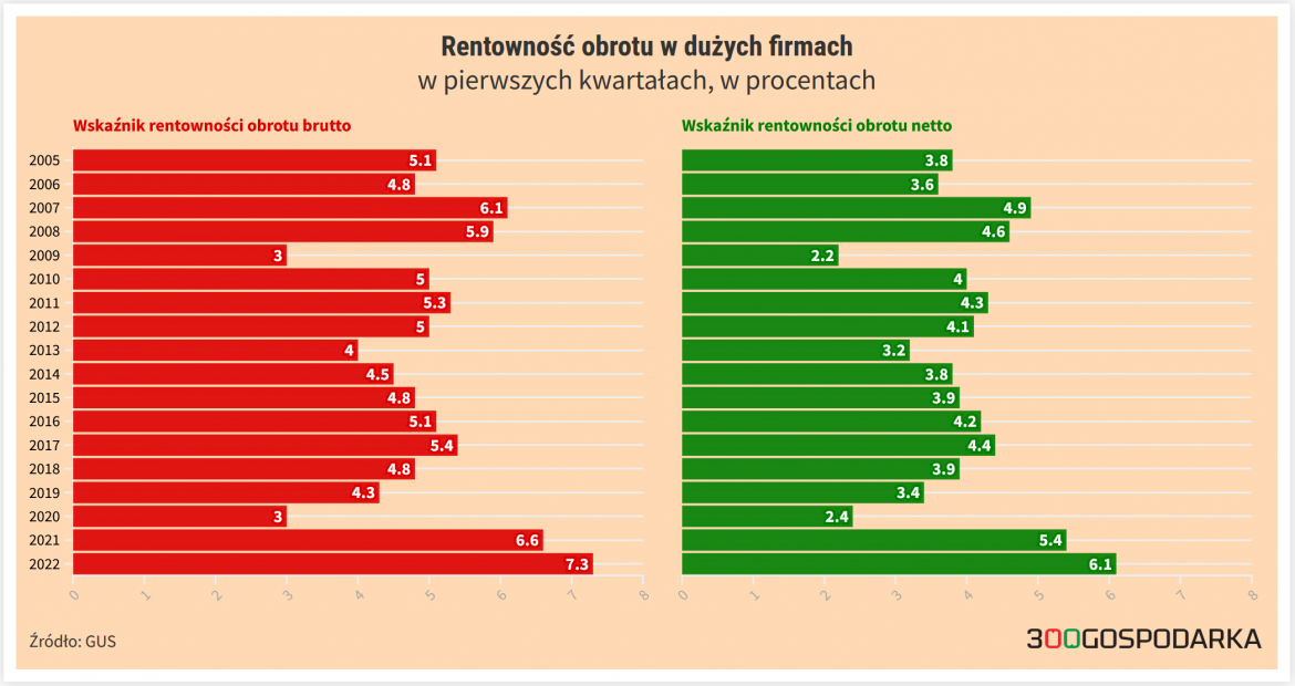 Według danych GUS wskaźnik rentowności obrotu brutto wyniósł w pierwszym kwartale 7,3 proc., a rentowności obrotu netto 6,1 proc. Tak wysokich nie było w historii badań, czyli co najmniej od 2003 roku.