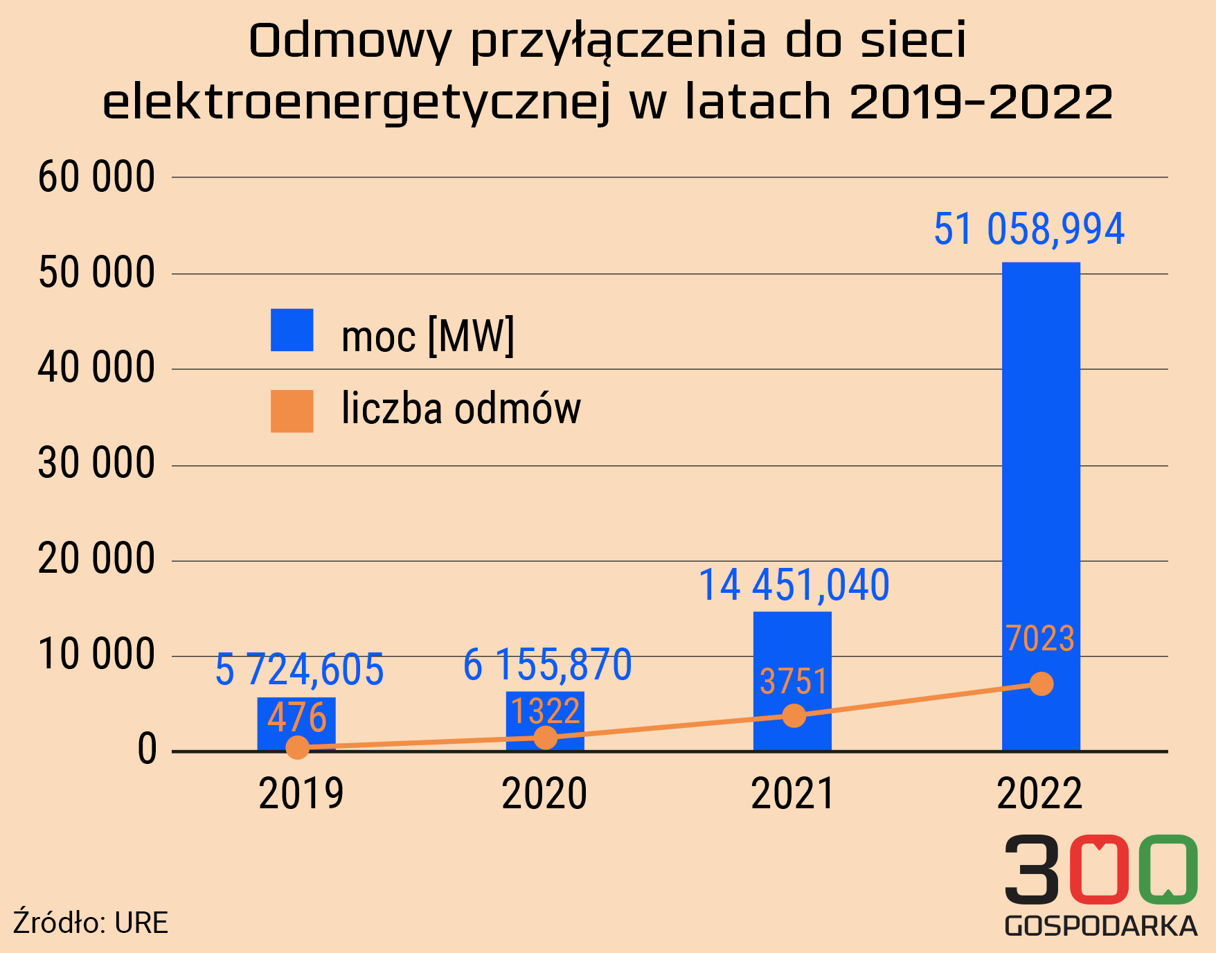 Ze sprawozdania URE za 2022 rok wynika, że odmów przyłączenia do sieci było w ubiegłym roku ponad 7 tysięcy. Dotyczyły źródeł energii o mocy łącznie 51 059 megawatów. W uzasadnieniu większości odmów powoływano się na brak warunków technicznych.