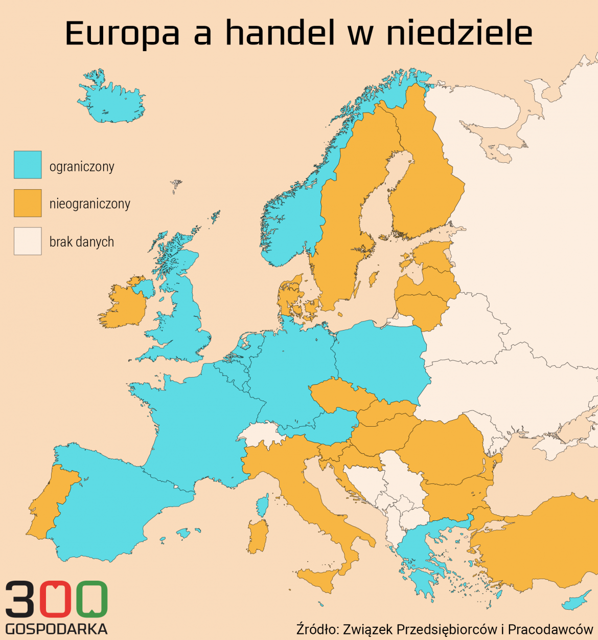 A jak to robią inni? Państwa europejskie w różny sposób regulują handel w niedziele. Najczęściej stosowanym rozwiązaniem jest brak jakichkolwiek ograniczeń. Swobodnie handlować w niedziele można w Bułgarii, Chorwacji, Czechach, Danii, Estonii, Finlandii, Węgrzech, Irlandii, Włoszech, Łotwie, Litwie, Portugalii, Rumunii, Słowacji, Słowenii, Szwecji i Turcji.