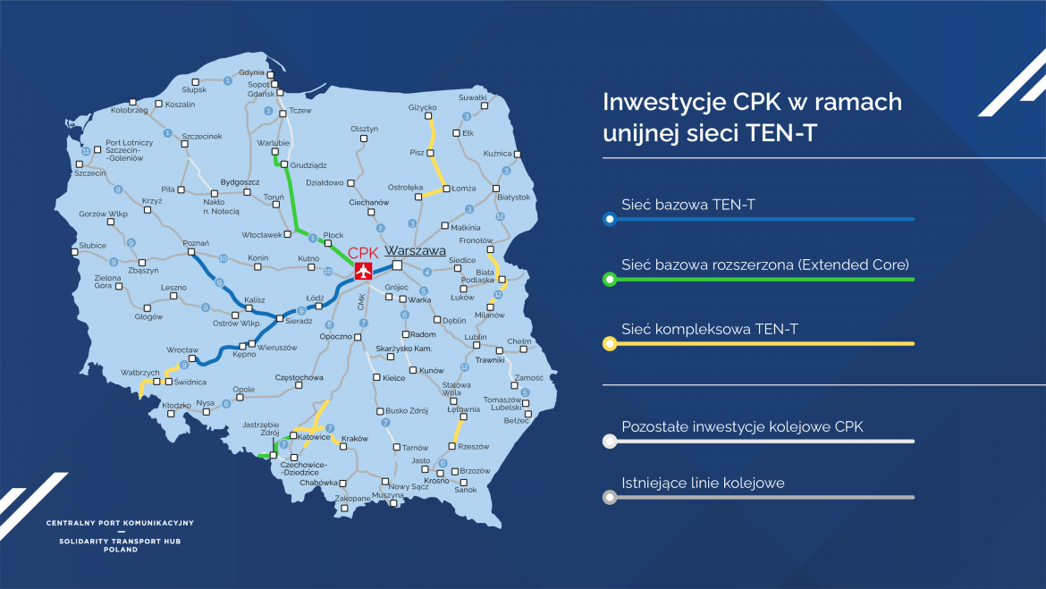 W tzw. sieci bazowej TEN-T znajduje się przygotowywana przez CPK linia Kolei Dużych Prędkości Warszawa – Łódź – Poznań/Wrocław (tzw. igrek). Wymagania są takie, że sieć bazowa powinna zostać zrealizowana przez kraje członkowskie – przy wykorzystaniu środków UE – do końca 2030 r., co wpisuje się w plany inwestycyjne CPK.