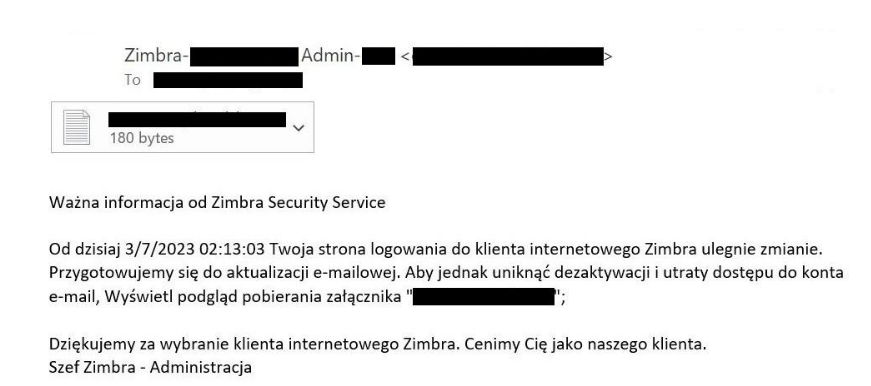 Atak rozpoczyna wiadomość e-mail z ostrzeżeniem o niezbędnej aktualizacji serwera poczty, dezaktywacji konta lub innym problemie technicznym. Użytkownik ma kliknąć w załączony plik. Po jego otwarciu wyświetlana jest fałszywa strona logowania Zimbra.
