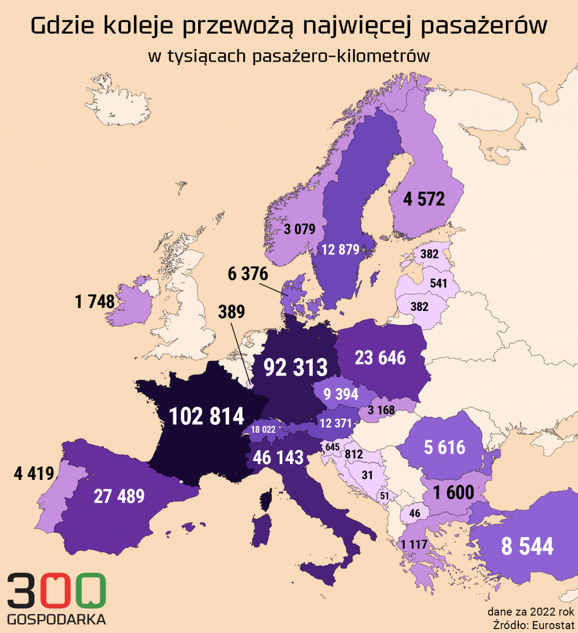 Niemcy przewieźli z kolei rekordową liczbę pasażerów (2,5 mld) w 2022 roku, co stanowiło 34 proc. całkowitej liczby pasażerów kolejowych w UE. Francja, Włochy i Hiszpania zajęły kolejno drugie, trzecie i czwarte miejsce z przewożąc odpowiednio 1,1 mld, 700 mln i 600 mln pasażerów.