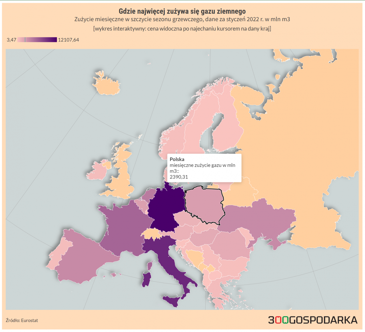 Podajemy dane ze stycznia, bo to w sezonie grzewczym konsumpcja gazu jest największa. W ciągu roku miesięczne zużycie się oczywiście zmienia. Dla porównania, już w czerwcu Niemcy zużyły niecałe 3,5 mld metrów sześciennych i spadły na drugie miejsce w Europie pod tym względem. Włochy, które zostały liderem, skonsumowały 4,2 mld metrów.