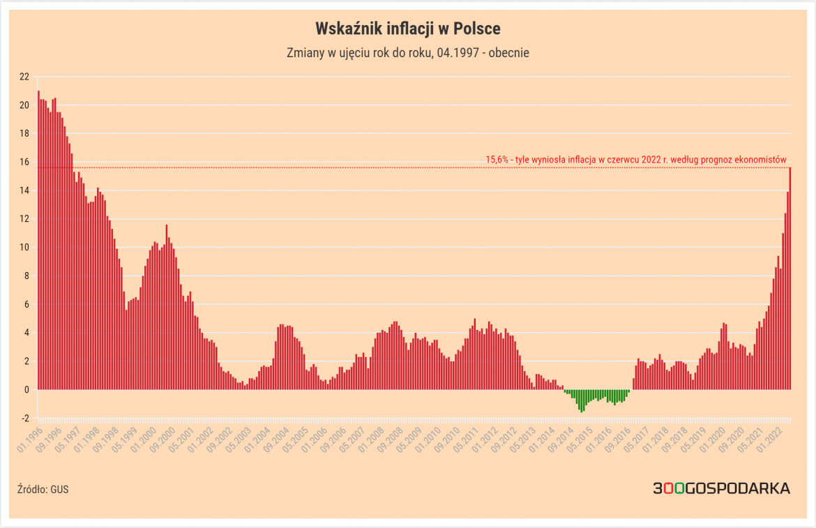 Inflacja konsumencka w Polsce w czerwcu 2022 r. wyniosła 15,6proc. w ujęciu rocznym według wstępnych danych Głównego Urzędu Statystycznego (GUS). To najwyższy wzrost cen od 1997 roku.