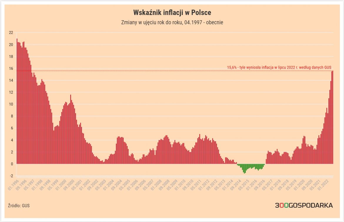 Inflacja konsumencka w Polsce w lipcu 2022 r. wyniosła 15,6 proc. w ujęciu rocznym według danych Głównego Urzędu Statystycznego (GUS). To najwyższy wzrost cen od 1997 roku.