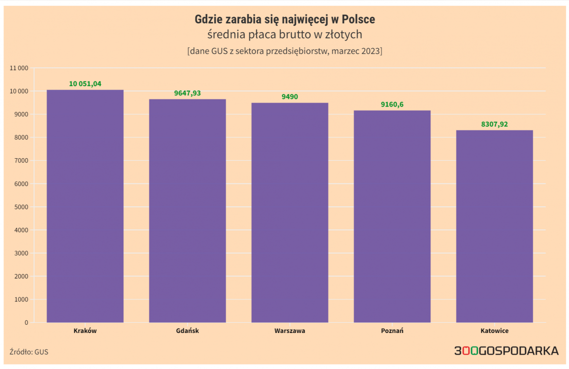 Wśród mieszkańców największych miast najwyższe zarobki w marcu mieli krakowianie. W ich przypadku przeciętna płaca brutto w firmach przekroczyła już 10 tys. zł. Warszawiacy zarabiali mniej, bo średnio 9490 zł. Więcej niż w stolicy firmy płaciły też w Gdańsku.
