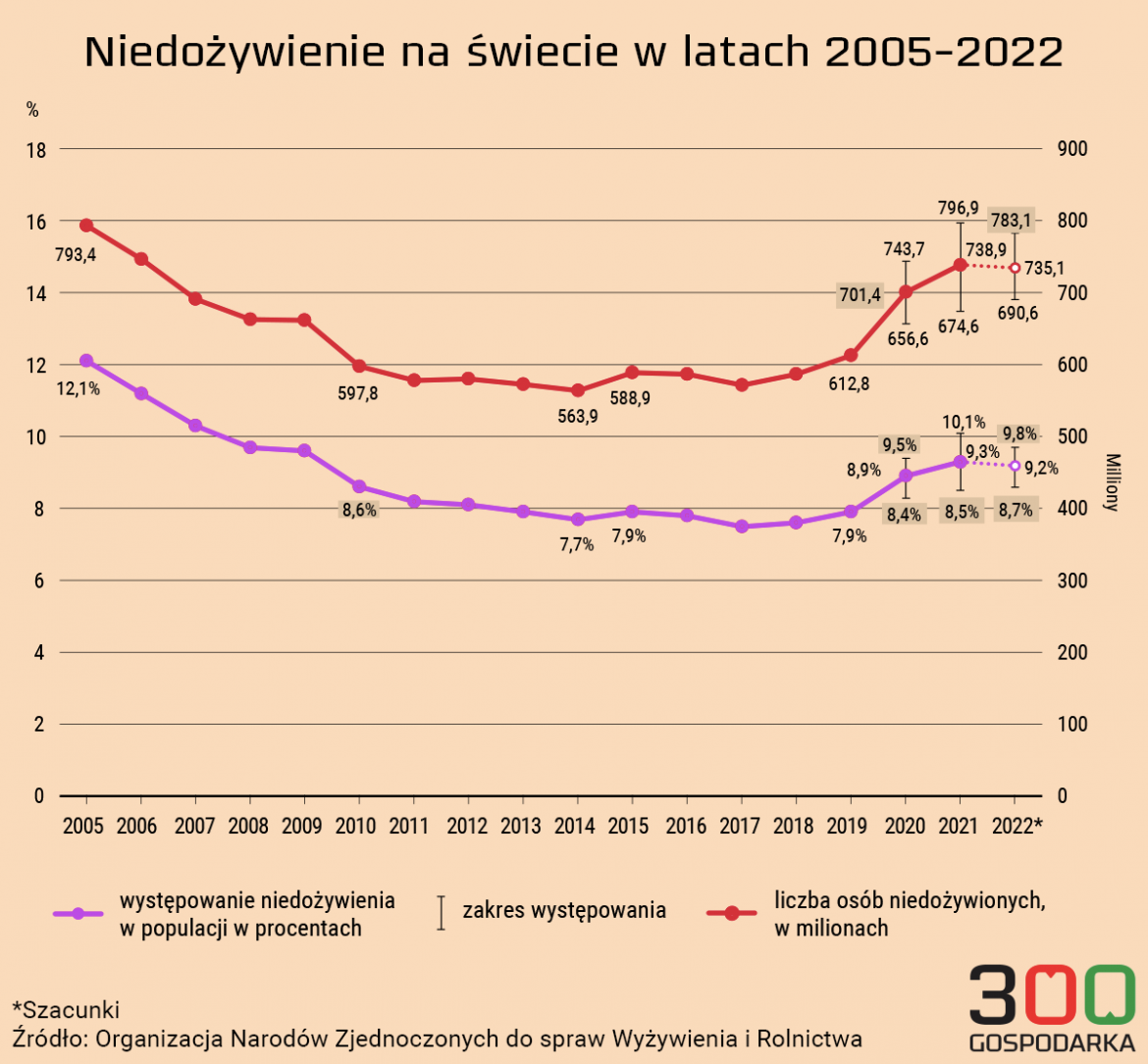 Autorzy raportu wskazują, że trwający globalny kryzys żywnościowy i żywieniowy jest największym we współczesnej historii ludzkości. W 78 monitorowanych krajach liczba osób dotkniętych poważnym brakiem bezpieczeństwa żywnościowego wzrosła ponad dwukrotnie w okresie od 2019 roku. Przed pandemią COVID-19 było to 149 mln osób, a w 2023 roku – 333 mln osób. W 2022 r. 9,2 proc. światowej populacji (735,1 mln osób) było niedożywionych, w porównaniu z 7,9 proc. populacji (612,8 mln osób) w 2019 r.