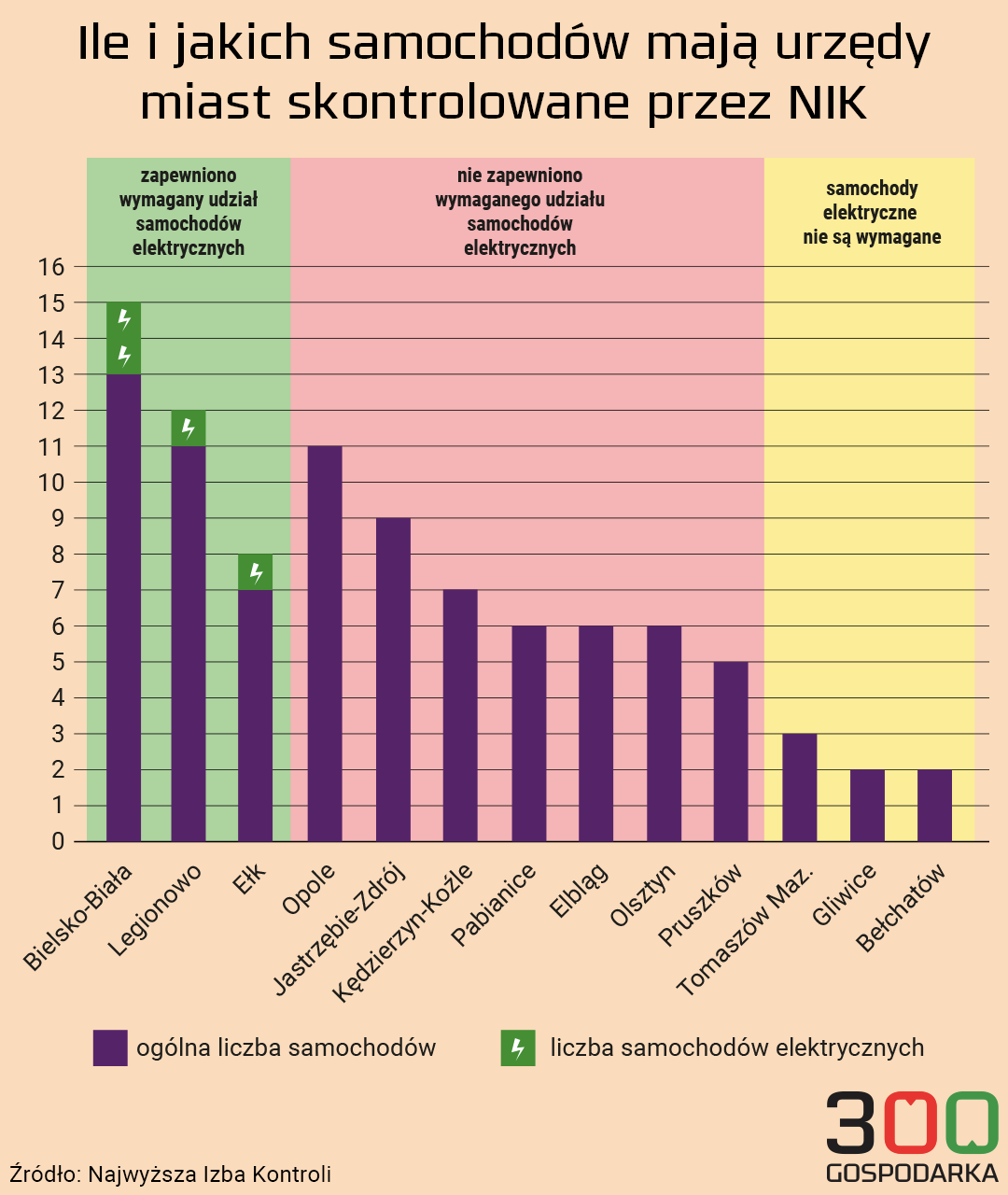 Nie zapewniono wymaganego udziału samochodów elektrycznych w: Opolu, Jastrzębiu-Zdroju, Kędzierzynie-Koźlu, Pabianicach, Elblągu, Olsztynie, Pruszkowie. Wymogu nie spełniły też urzędy marszałkowskie województw: łódzkiego ani mazowieckiego.