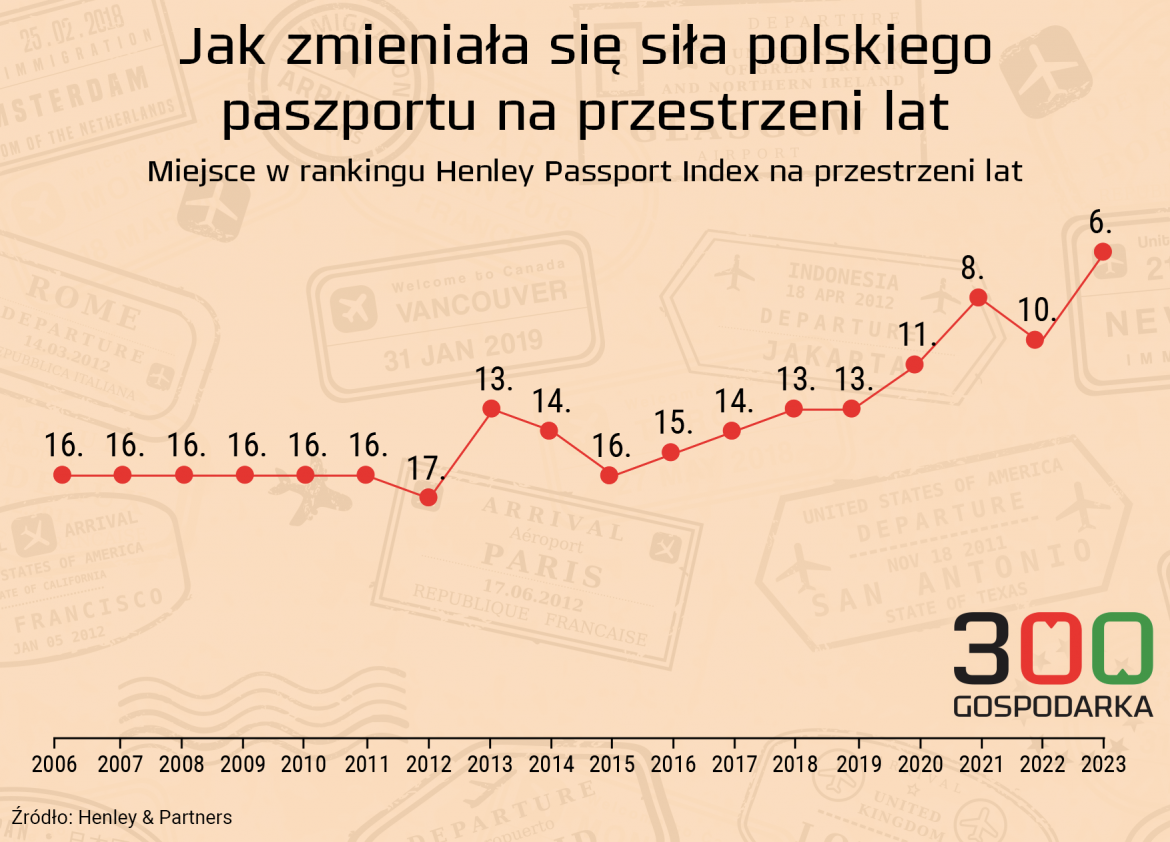 Na tym wykresie możemy zobaczyć, jak zmieniała się siła polskiego paszportu na przestrzeni lat:
