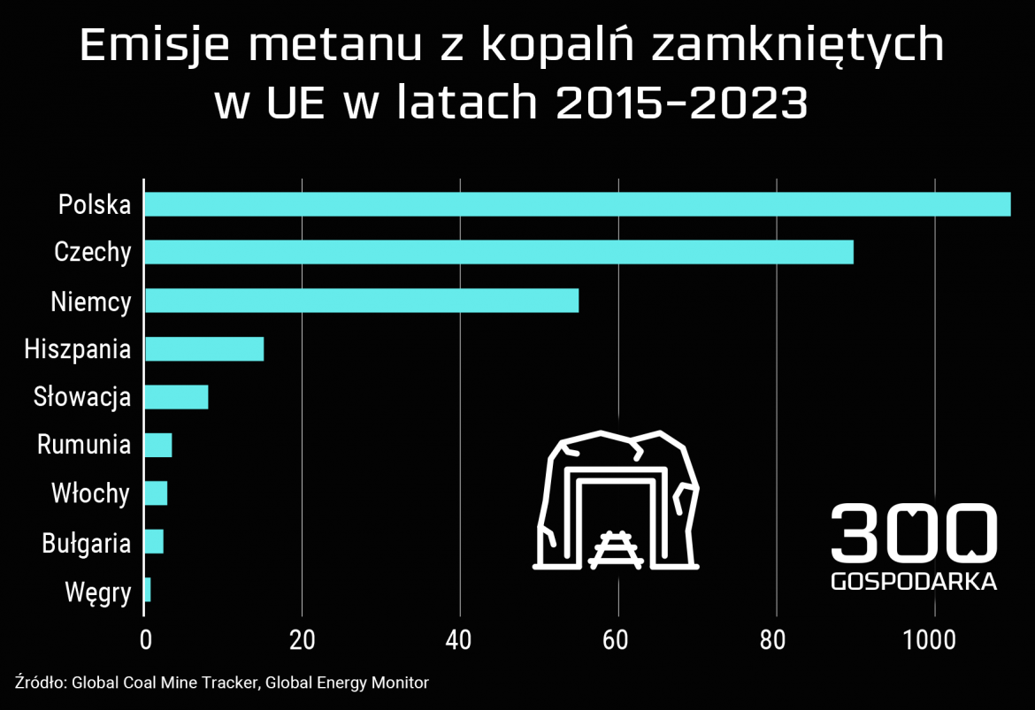 Think-tank szacuje, że wszystkie kopalnie zamknięte w państwach Unii w tym okresie emitują 287 milionów metrów sześciennych, czyli 193 kilotony, metanu rocznie. Liderem jest także w tej kategorii Polska, a tuż za nią plasują się Czechy. Pokazuje to poniższy wykres.