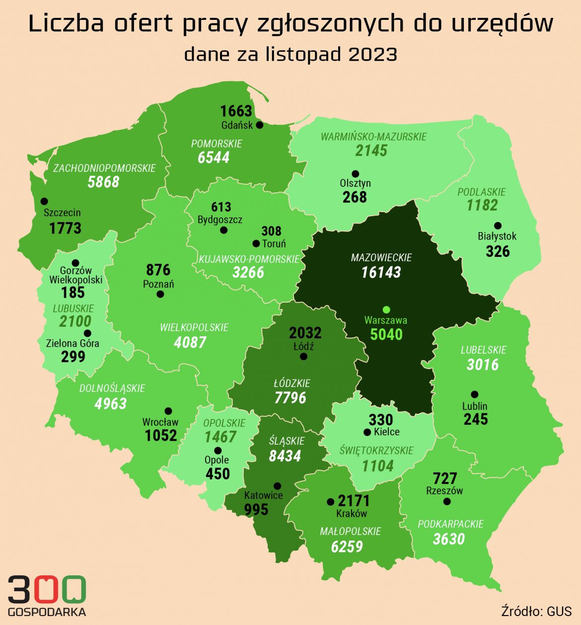Jak wynika z najnowszych danych GUS, w listopadzie najwięcej ofert pracy zgłoszono do urzędów pracy w Warszawie i woj. mazowieckim. To odpowiednio 5040 oraz 16 143 propozycji.