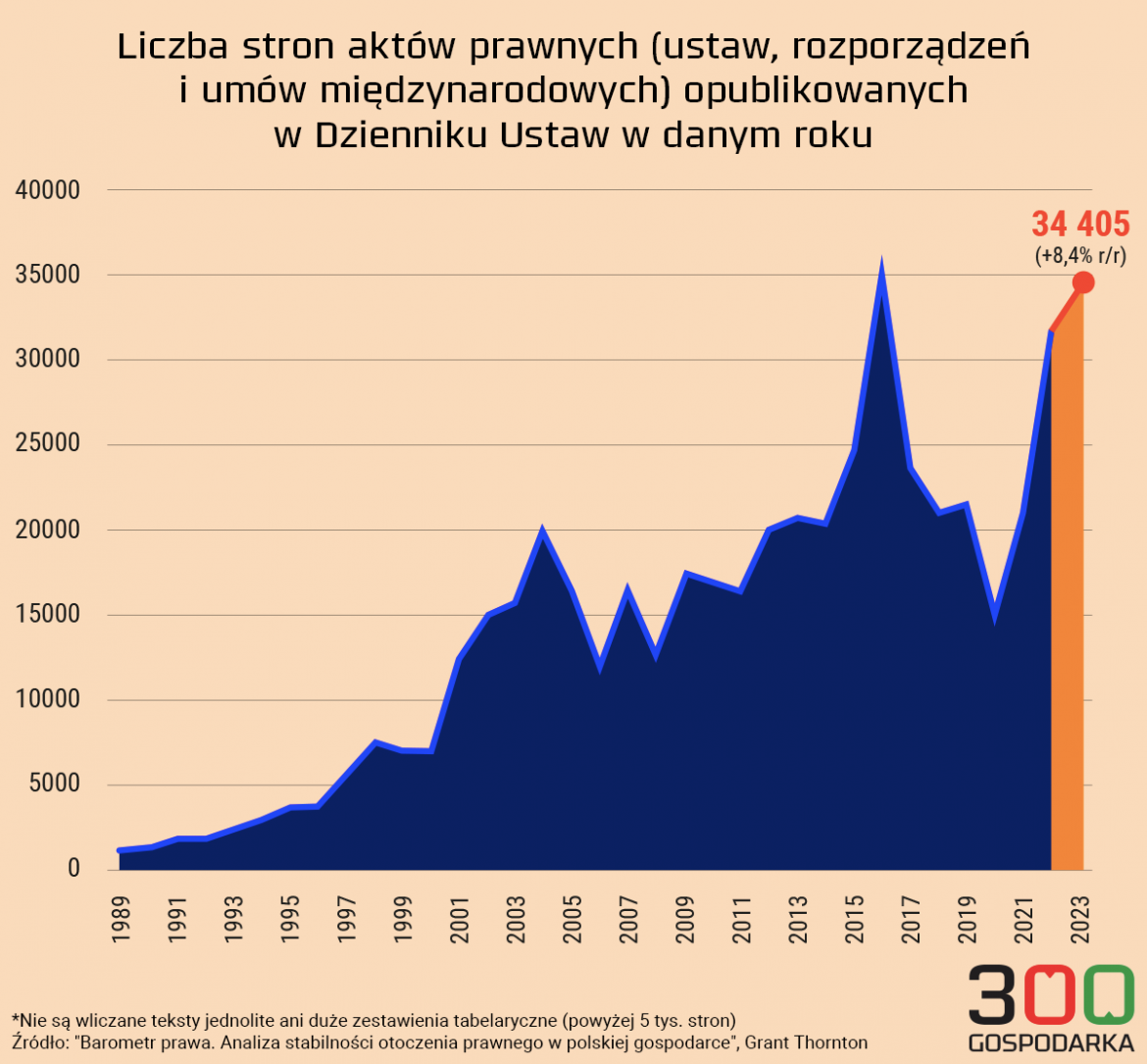 Grant Thornton zwraca uwagę, że produkcja prawa systematycznie rośnie od początku transformacji ustrojowej. Największy skok nastąpił w 2016 roku, kiedy uchwalono ponad 35 tys. stron nowego prawa.