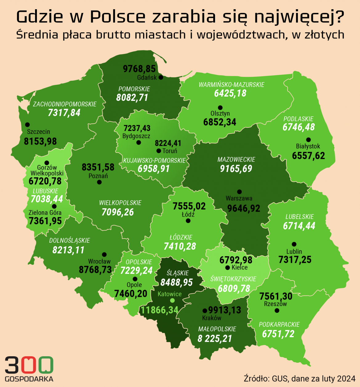 A co z Warszawą? Stolica, która była numerem jeden w poprzednim rankingu płac, teraz znalazła się dopiero na czwartym miejscu. Tu przeciętne miesięczne wynagrodzenie brutto w sektorze przedsiębiorstw w lutym 2024 r. wyniosło 9646,92 zł.