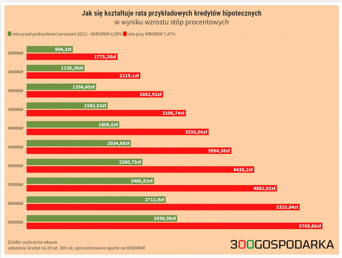 Oznacza to, że oprocentowanie kredytów hipotecznych, zaciąganych w trakcie pandemii, gdy stopy procentowe były bliskie zera, teraz wzrosło niemal do dwucyfrowych poziomów. Zakładając, że średnia marża banku wówczas wynosiła 2,3 proc., oprocentowanie oparte na WIBOR 6M obecnie sięga już 9,8 proc. To musi się przekładać na wzrost rat.