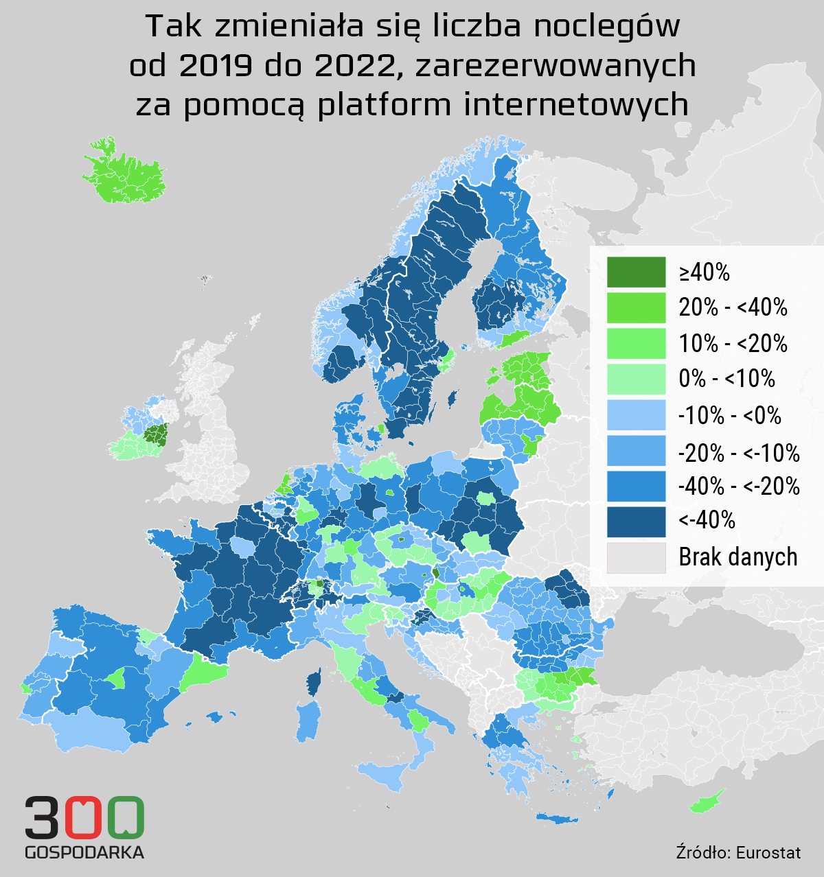 Dane za 2022 rok według regionów wskazują na ogólny wzrost turystyki platformowej od czasów sprzed pandemii. Dotyczą one noclegów na wynajem krótkoterminowy i zarezerwowanych za pośrednictwem Airbnb, Booking, Expedia Group lub TripAdvisor