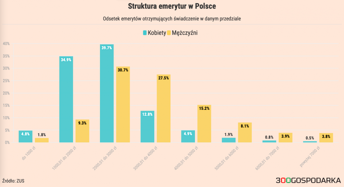 Szczególnie rażące różnice są w przypadku najwyższych wypłat. Ok. 5 razy większy odsetek emerytów niż emerytek dostaje świadczenie większe niż 5000 złotych. Do tego w porównaniu z analogicznym okresem roku poprzedniego populacja mężczyzn pobierających emeryturę w tej wysokości wzrosła o 112,7 tysięcy, co stanowi ponad 2-krotnie większy wzrost niż w populacji kobiet.