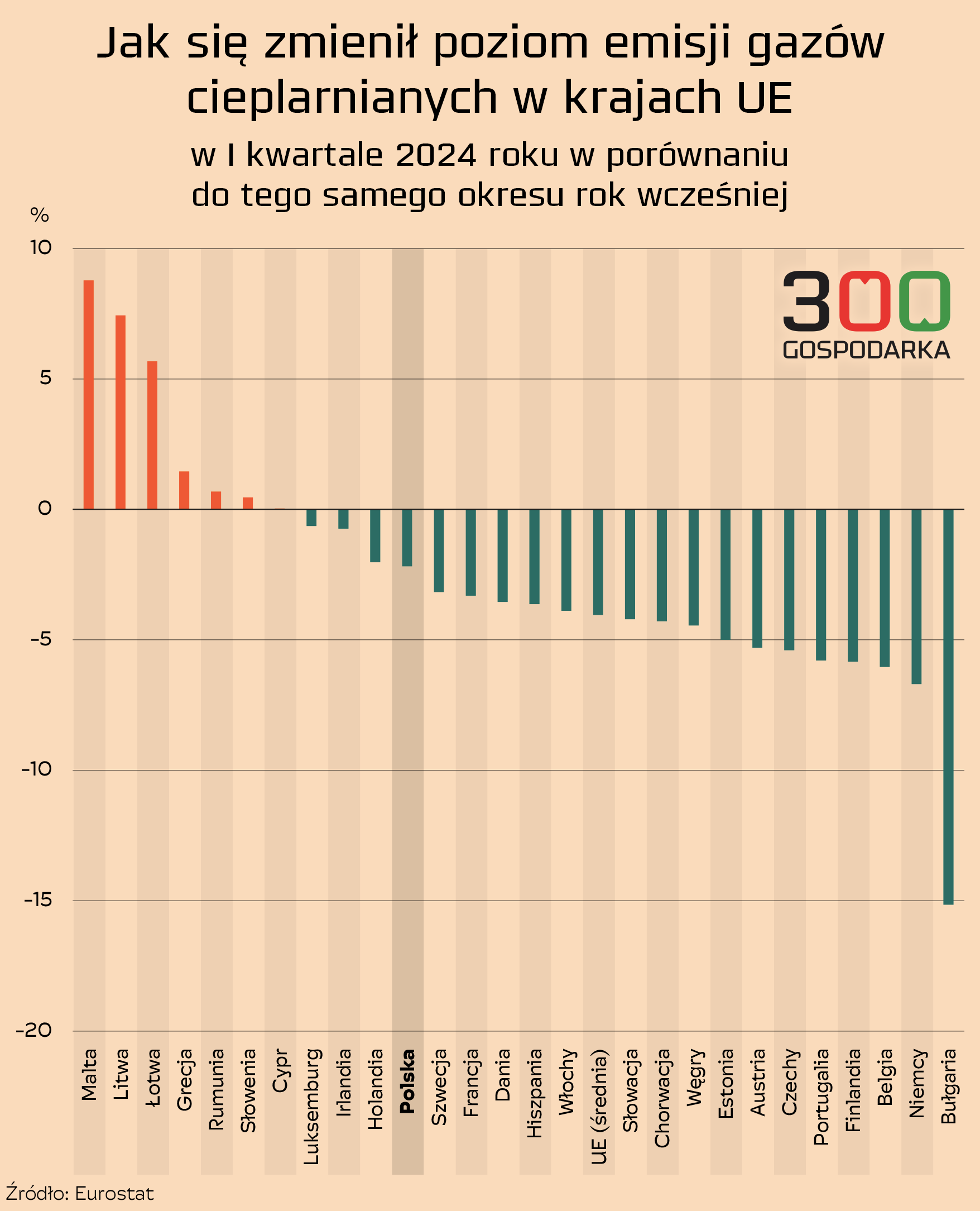 Eurostat podaje, że w pierwszym kwartale 2024 roku spadek emisji gazów cieplarnianych odnotowano w 20 krajach UE. Najwyższe redukcje oszacowano dla Bułgarii (-15,2 proc.), Niemiec (-6,7 proc.) i Belgii (-6 proc.).