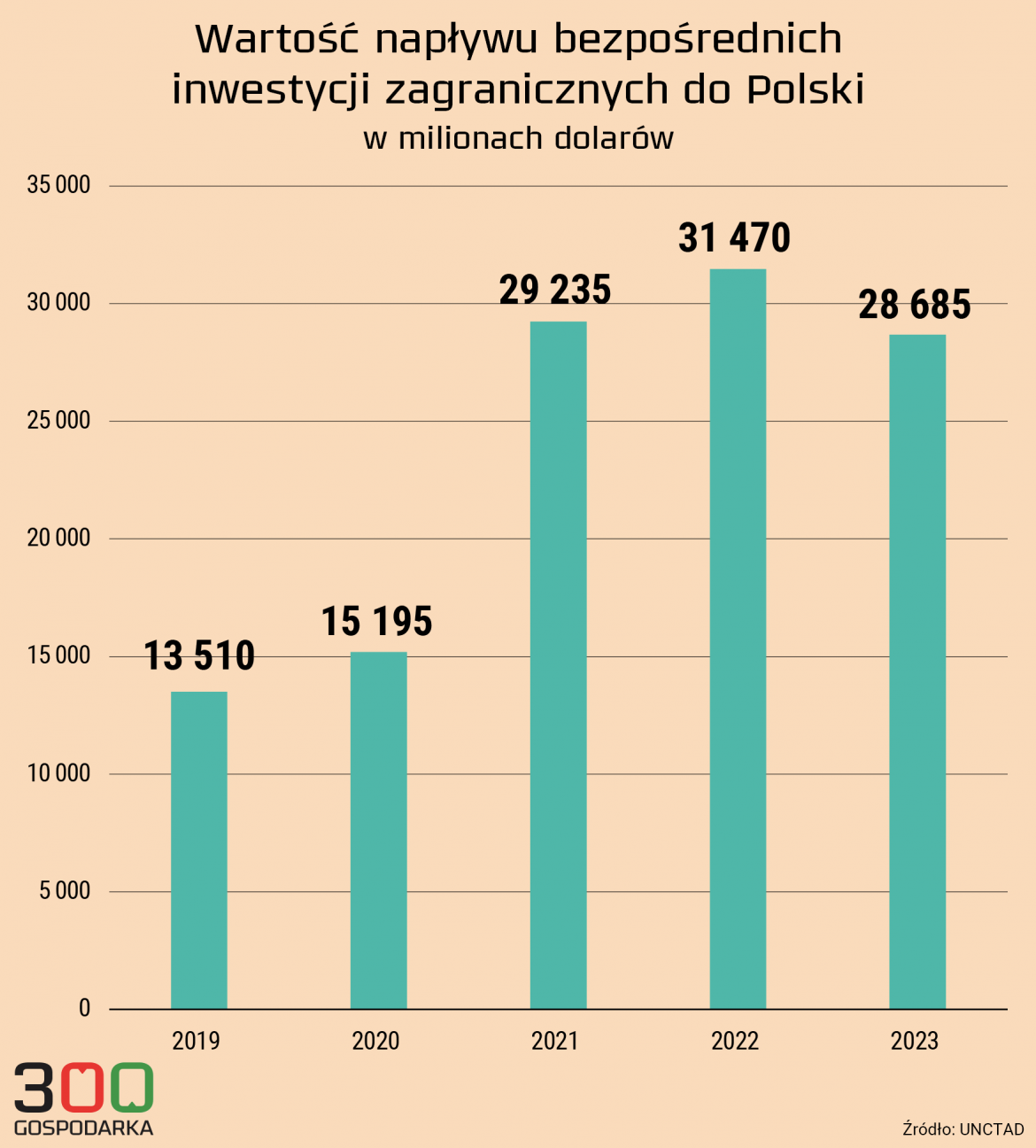 Według danych UNCTAD w 2022 roku do Polski trafiło 31,5 mld dolarów BIZ. Napływ bezpośrednich inwestycji zagranicznych zmniejszył się więc rok do roku o 8,8 proc.