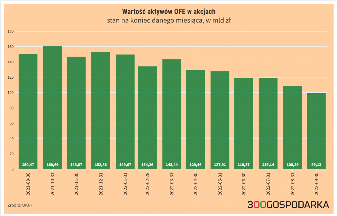 Skutek? Z najnowszych danych opublikowanych przez Urząd Komisji Nadzoru Finansowego wynika, że na koniec września OFE miały w akacjach nieco ponad 99 mld zł. Od początku roku portfel akcyjny funduszy skurczył się aż o 53,7 mld zł. I co gorsza wygląda na to, że to przede wszystkim efekt ostatnich wydarzeń, gdzie tzw. czynniki krajowe odegrały bardzo ważną rolę. Bo w dwa miesiące – w sierpniu i we wrześniu – wartość portfela akcyjnego OFE zmalała o 20 mld zł.