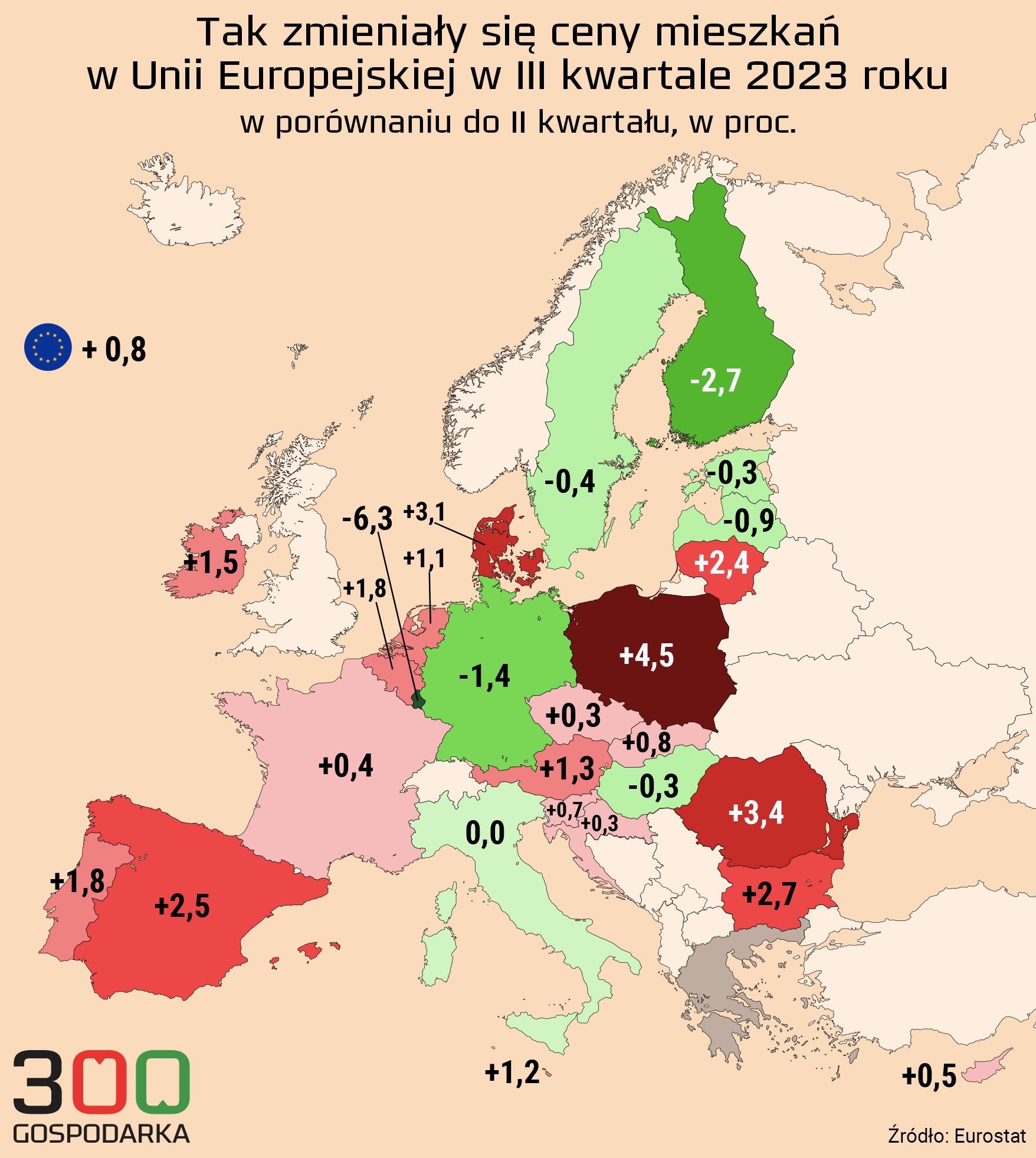 Spadki cen nieruchomości zaobserwowano natomiast jedynie w trzech państwach: w Grecji (o 14 proc.), we Włoszech (8 proc.) i na Cyprze (3 proc.).