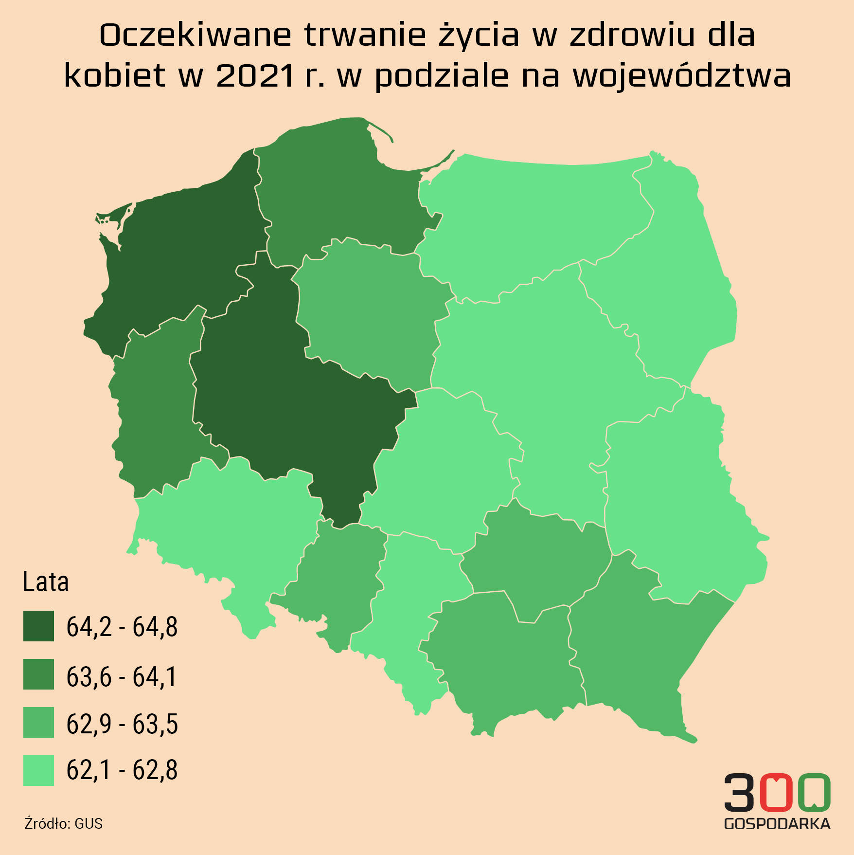 Największe szanse na dłuższe życie w zdrowiu mają kobiety mieszkająca na zachodzie kraju. Najwyższy wskaźnik zanotowano w woj. wielkopolskim – wynosi ono 64,8 roku, a także zachodniopomorskim i lubuskim (po 64,5 roku). Ogółem cała ściana zachodnia może poszczycić się wyższym wskaźnikiem trwania życia w zdrowiu.