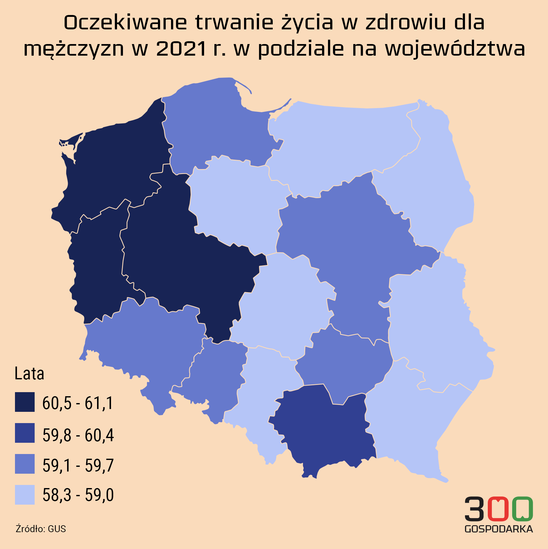 W 2021 r. wskaźnik HLY, czyli oczekiwanych lat przeżytych w zdrowiu (ang. Healthy Life Years) najbardziej zmniejszył się dla mężczyzn w województwach podlaskim (o 0,9 roku), podkarpackim (o 0,6 roku), lubelskim oraz lubuskim (o 0,5 roku).