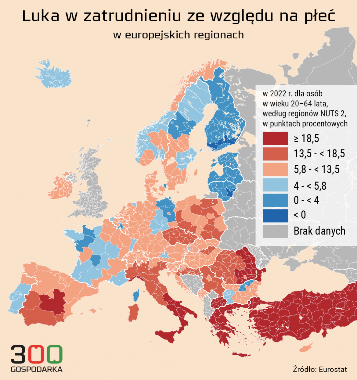 Z publikacji Eurostatu wynika, że największe różnice w poziomie zatrudnienia kobiet i mężczyzn są na południu Europy. Z kolei w Europie Północnej luka jest najmniejsza. Polska plasuje się gdzieś po środku, choć w kilku województwach skala różnic zbliża bardziej do baseny Morza Śródziemnego, niż do państw nordyckich. Pokazuje to mapa, jaką stworzyliśmy na podstawie danych Eurostatu.