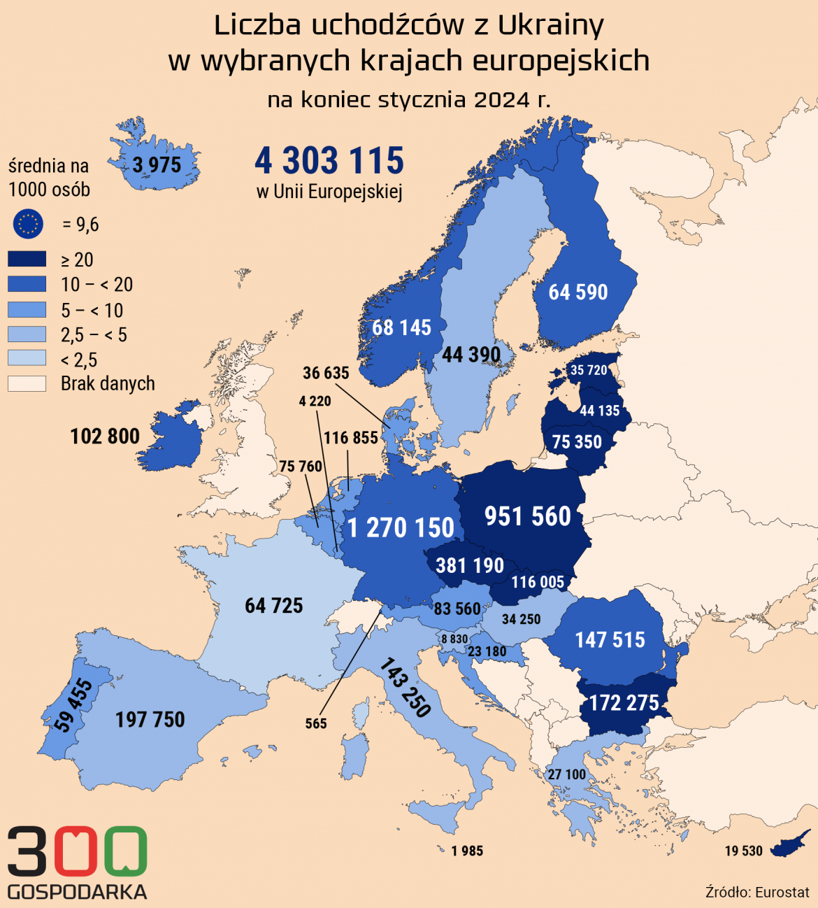 Wróćmy jednak do Eurostatu. W porównaniu z populacją każdego kraju UE, najwyższe liczby ogólnych beneficjentów tymczasowej ochrony na 1000 osób na koniec stycznia tego roku zaobserwowano w Czechach (35,2), Bułgarii (26,7), Litwie (26,4), Estonii (26,2) i Polsce (25,9). Podczas gdy średnia wartość dla UE to 9,6 na 1000 osób. To oznacza, że jesteśmy jednym z państw, które przyjęły relatywnie dużą liczbę uchodźców wojennych z Ukrainy w stosunku do swojej populacji.