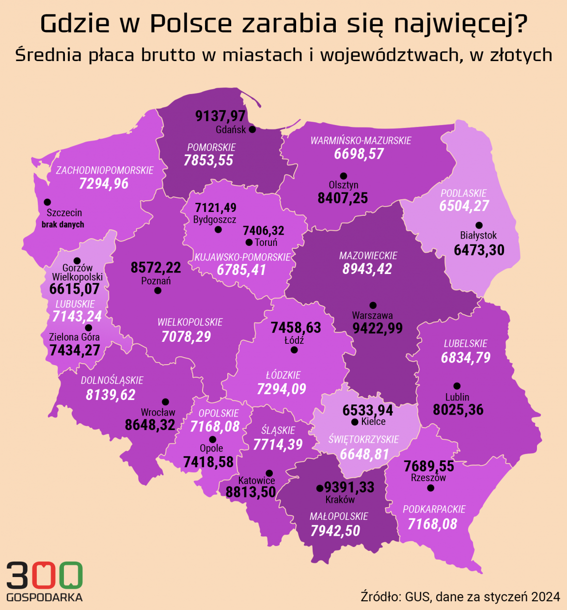 Jak się prezentują wynagrodzenia w największych miastach pokazuje ta mapa: