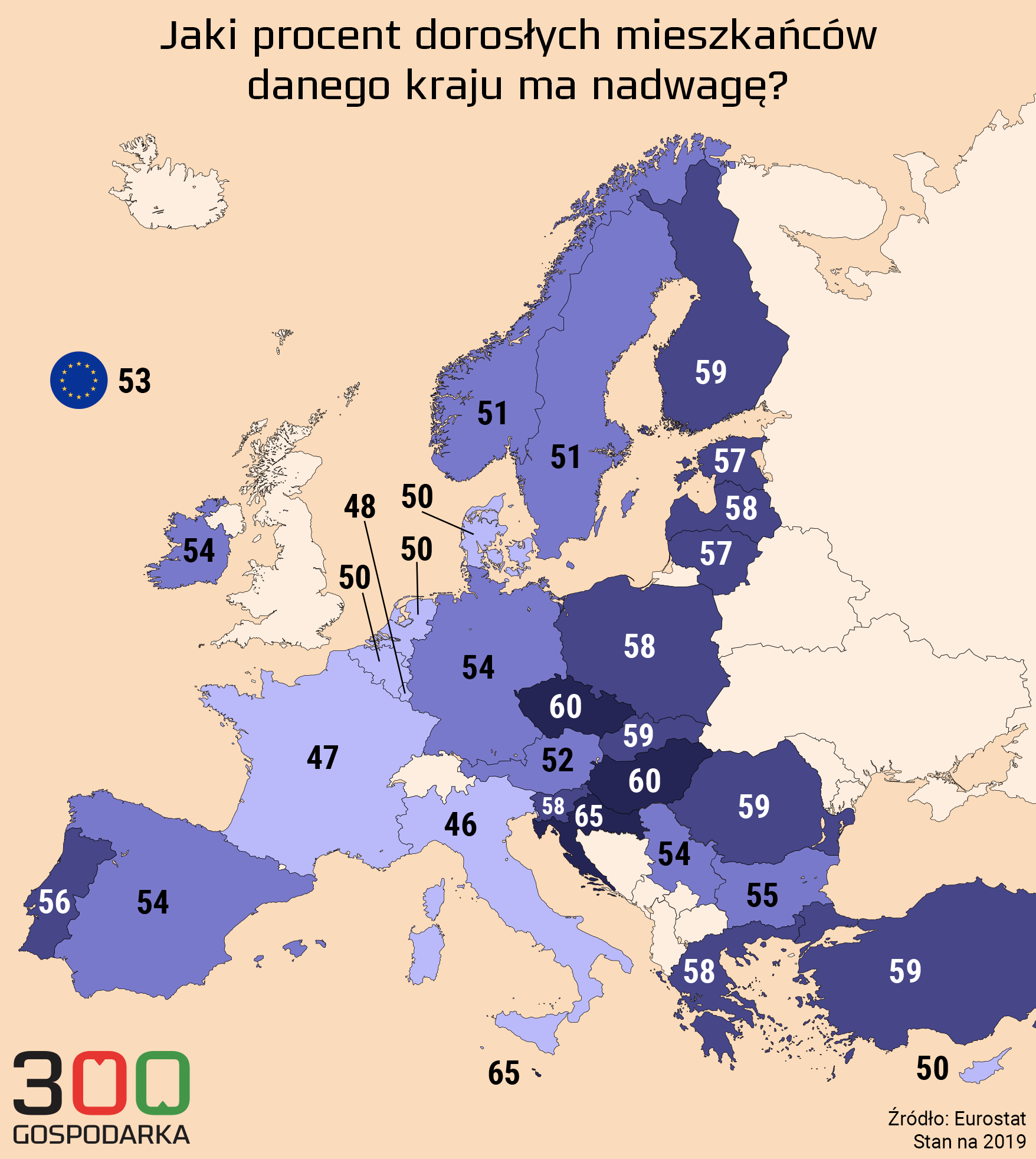 Polska niestety nie może poszczycić się dobrymi wynikami. Na otyłość lub nadwagę cierpi aż połowa społeczeństwa, bo 57 proc. Polaków. Tą przypadłością dotkniętych jest dokładnie połowa kobiet w Polsce, co plasuje nas w połowie stawki. Gorzej jest natomiast w przypadku mężczyzn – na nadwagę cierpi prawie 70 proc. dorosłych Polaków, z czego 20 proc. jest otyła.
