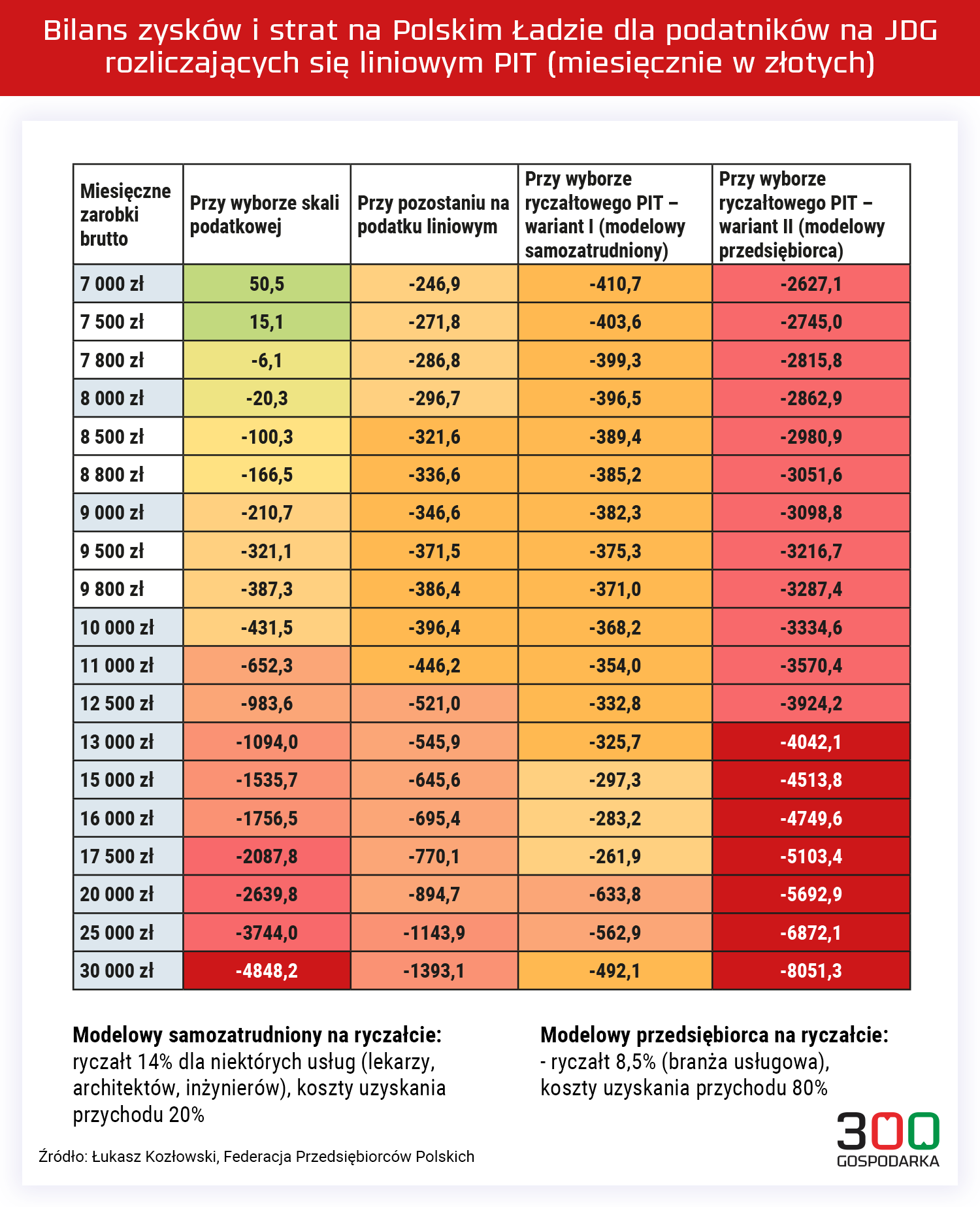 Ale można z grubsza przyjąć, że zainteresowani zmianą będą ci, którzy byli do tej pory na JDG, zarabiali ponad 11 tys. zł brutto na samozatrudnieniu (czyli mieli bardzo niskie koszty działalności gospodarczej) i rozliczali się z fiskusem za pomocą liniowego 19-procentowego PIT. Dla kogoś takiego trwanie przy liniówce może się nie opłacać, za to na atrakcyjności zyskuje ryczałtowy PIT naliczany od przychodów. Zwłaszcza, jeśli rodzaj usługi lub towaru, oferowany przez samozatrudnionego, uprawnia do niskiej stawki ryczałtowego PIT.