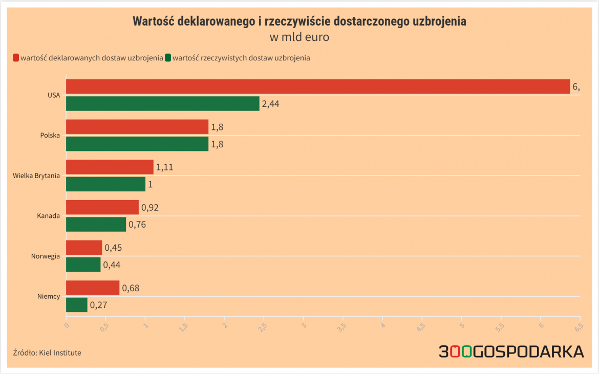 Dobrze widać to na przykładzie deklarowanych dostaw uzbrojenia i rzeczywistej wartości już wysłanych transportów. Kraje Zachodu obiecały już Ukraińcom broń o wartości 13,7 mld euro. Jak dotąd dostarczyły sprzęt wart 8,5 mld euro.