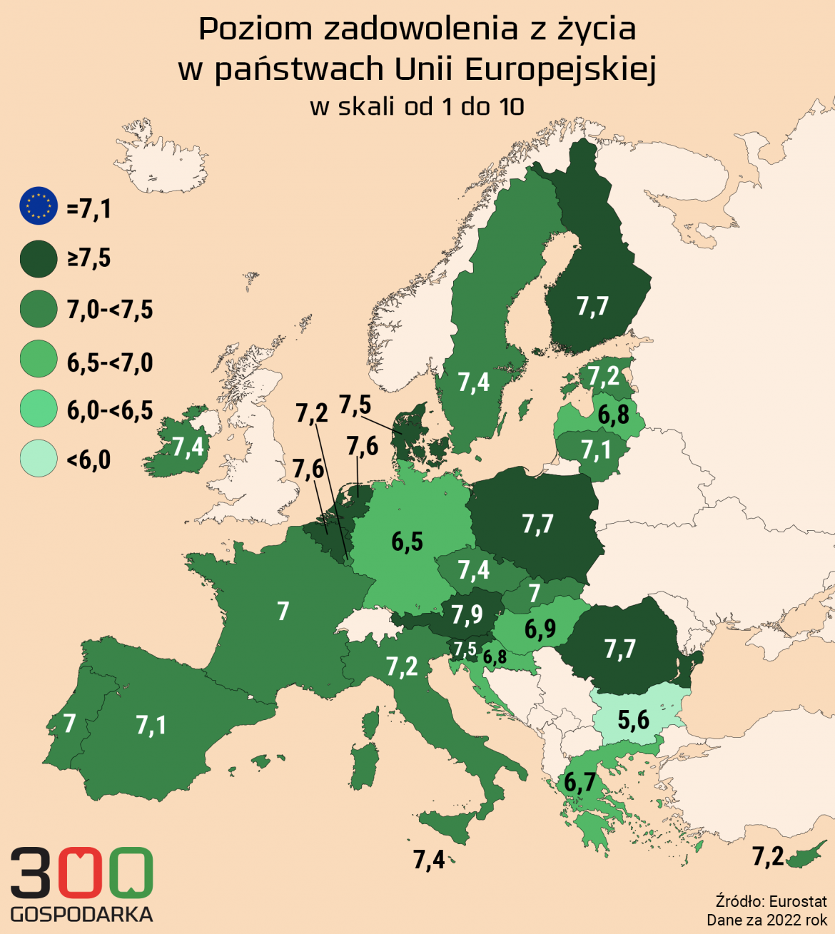 Mieszkańcy UE proszeni byli o ocenę ogólnego zadowolenia z życia w skali od 1 do 10. Średnia dla całej Unii wypadła na poziomie 7,1. Ocena ta była najwyższa w Austrii (7,9), Finlandii, Polsce i Rumunii (po 7,7), Belgii i Holandii (po 7,6). Natomiast najniższy poziom satysfakcji odnotowano w Bułgarii (5,6), Niemczech (6,5) i Grecji (6,7).