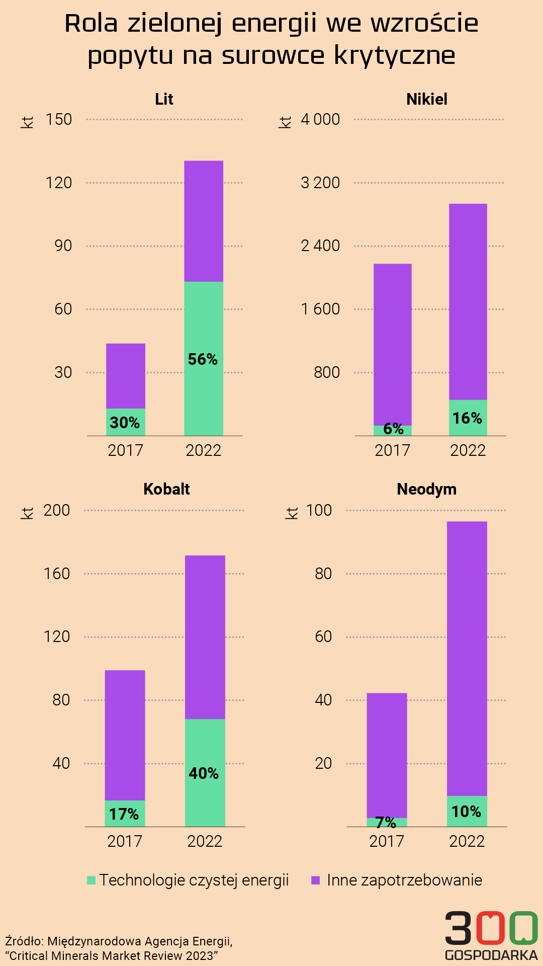 – W latach 2017-2022 sektor energetyczny był głównym czynnikiem, który przyczynił się do potrojenia ogólnego popytu na lit, 70-proc. wzrostu popytu na kobalt i 40-proc. wzrostu popytu na nikiel – czytamy w raporcie.