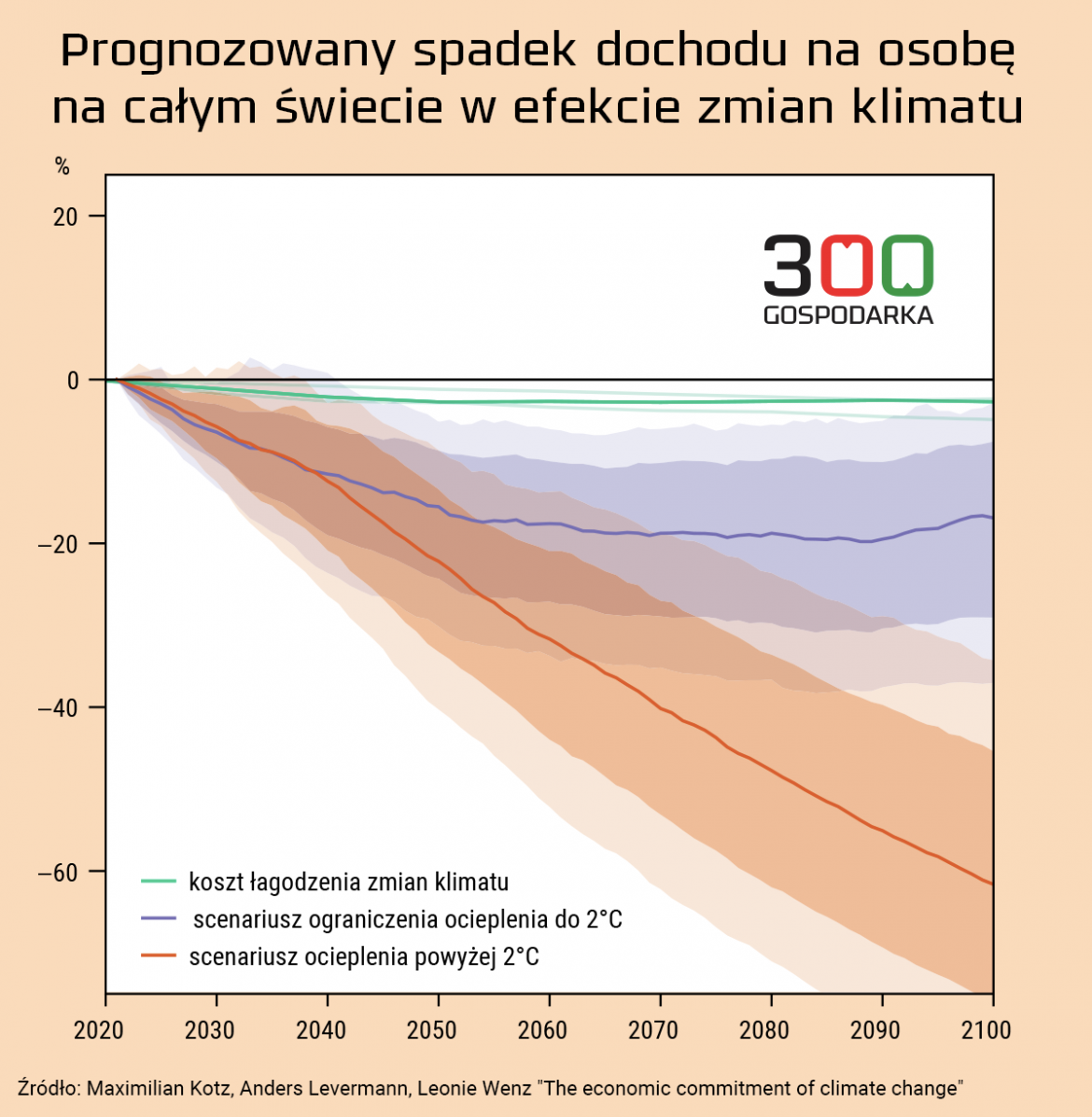 Zmiany klimatu przyczynią się do spadku dochodów w skali całego świata o 19 proc. do 2050 roku, co oznacza 38 bilionów dolarów strat rocznie. W Polsce spadek wyniesie niemal 10 proc. Natychmiastowe działanie na rzecz obniżenia emisji może pozwolić na uniknięcie jeszcze większych strat w kolejnych latach.