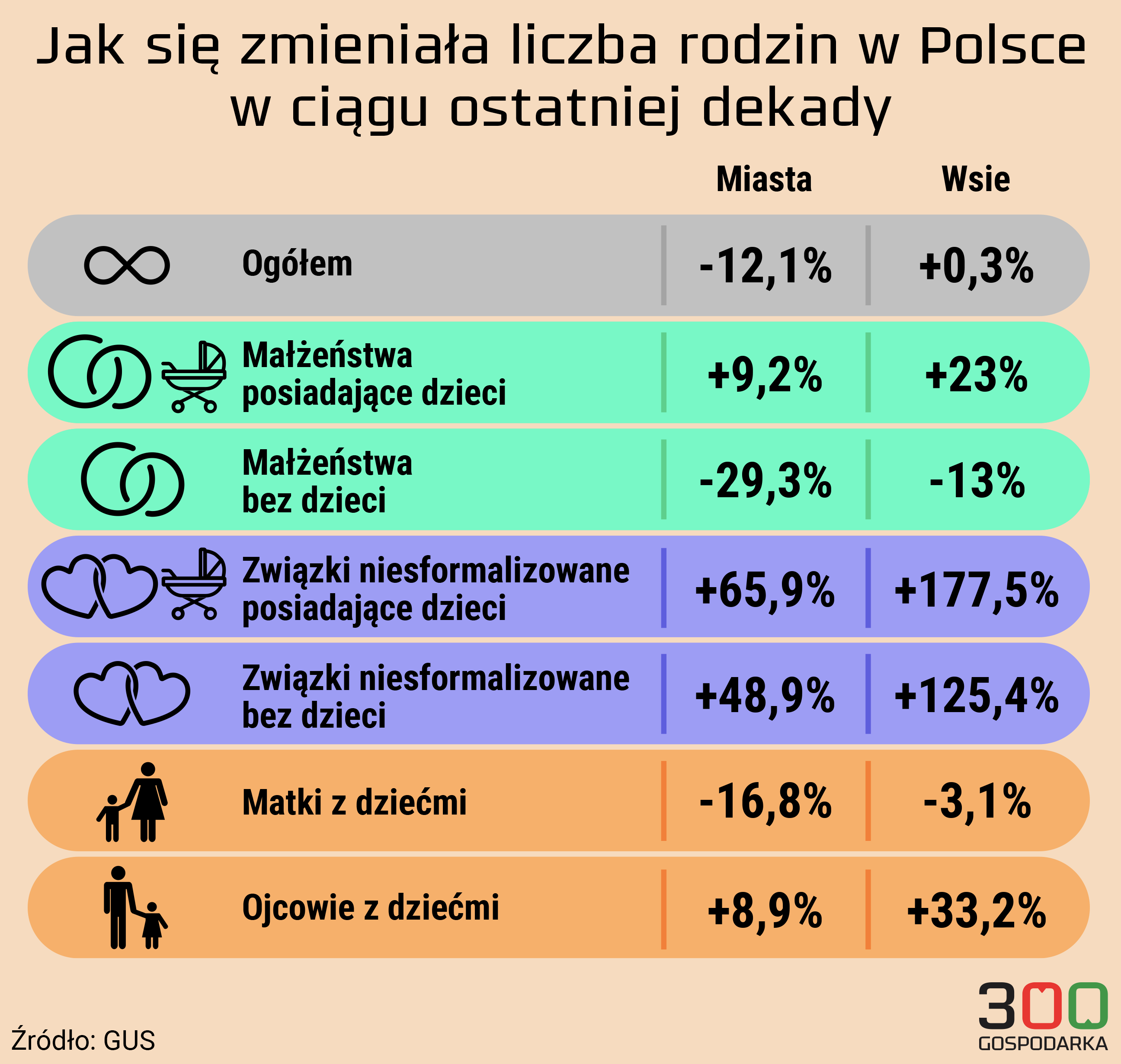Rodzin ubywało przede wszystkim w miastach. I było to spowodowane przez dwa efekty. Po pierwsze zmniejszeniem się liczby rodzin w ogóle. Po drugie, przenoszeniem się rodzin z miast na wieś, najczęściej do gmin podmiejskich skupionych wokół dużych aglomeracji. To m.in. dlatego we wsiach odnotowano niewielki wzrost liczby rodzin – 0,3 proc.