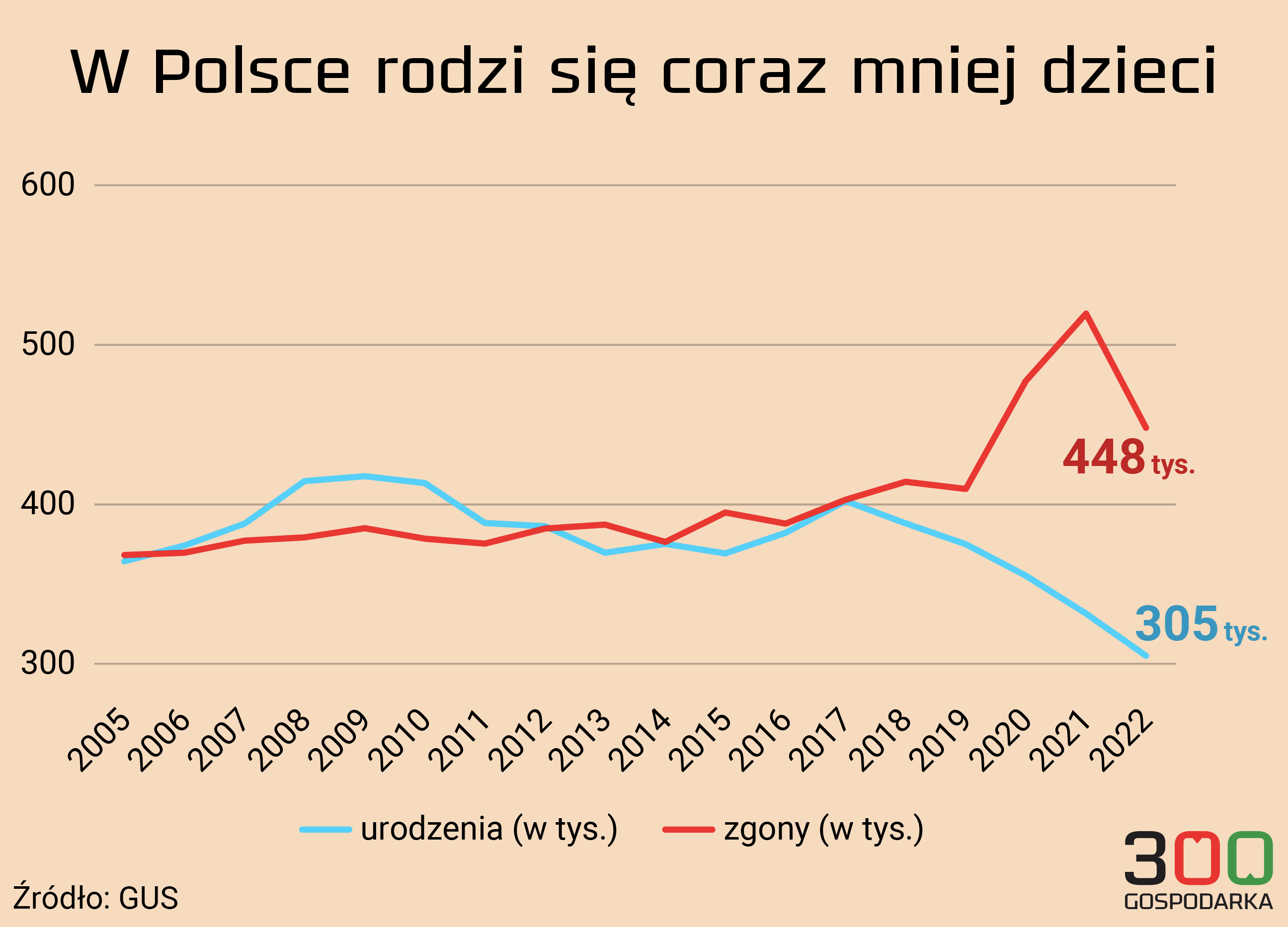 Równolegle utrzymuje się tendencja, w której liczba zgonów znacznie przekracza liczbę urodzeń. W 2022 r. wynosiła zgonów było 448 tysięcy. I choć to mniej niż w szczytowym momencie pandemii, to i tak wynik jest dość ponury. Polska ma głęboko ujemny przyrost naturalny i jest to jeden z najgorszych wyników co najmniej w tym wieku.