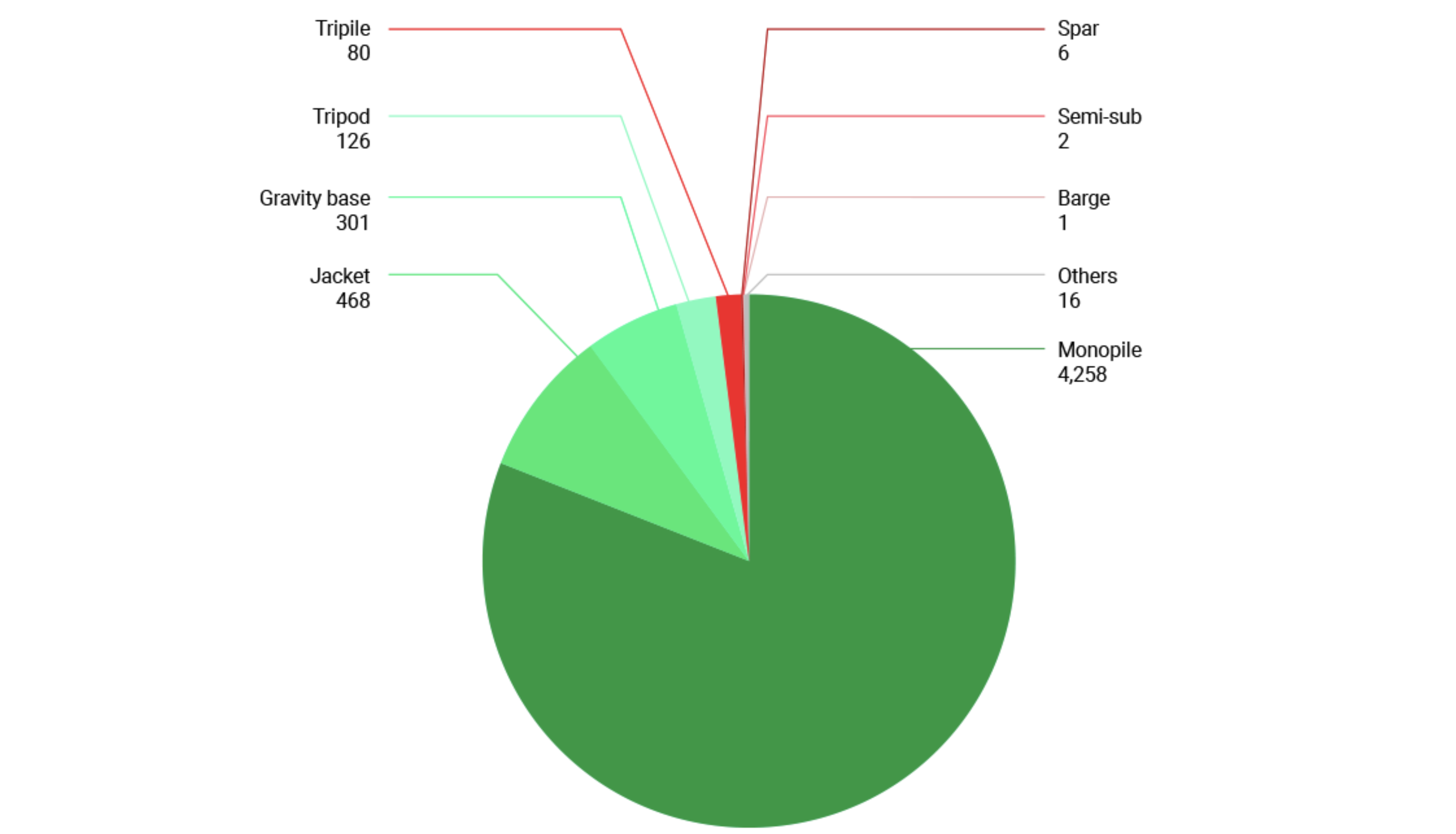 Poniższy wykres przygotowany na podstawie danych Wind Europe pokazuje liczbę wiatraków podłączonych do sieci w Europie, które są podzielone według typów fundamentów.