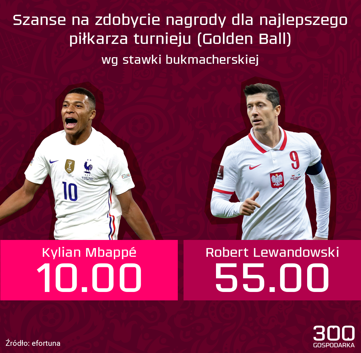 Jako faworyt do zwycięstwa, typowany przez firmę bukmacherską efortuna, jest Francuz Kylian Mbappé. Stawka na niego wynosi 1 do 10. Dla porównania, szanse najwyżej notowanego Polaka, Roberta Lewandowskiego, to 1 do 55. Czyli, mówiąc wprost, prawdopodobieństwo, że to Lewy zostanie najlepszym graczem mistrzostw jest znacznie mniejsze, niż zwycięstwo gwiazdora reprezentacji Francji w tym rankingu.